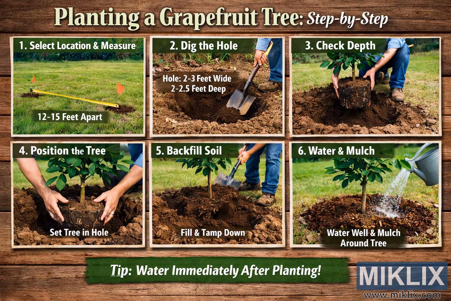 Slika je široki, pejzažno orijentirani instruktivni kolaž koji vizualno objašnjava korak-po-korak proces sadnje stabla grejpa s ispravnom dubinom i razmakom. Cjelokupni dizajn podsjeća na vrtlarski vodič ili edukativni poster, postavljen na toplu, rustikalnu drvenu pozadinu koja uokviruje cijelu kompoziciju. Na vrhu, podebljani naslov glasi "Sadnja stabla grejpa: Korak po korak", koristeći zelena i bijela slova koja pojačavaju prirodnu, hortikulturnu temu. Ispod zaglavlja, slika je podijeljena na šest jasno označenih panela raspoređenih u dva reda od po tri, pri čemu svaki panel predstavlja zasebnu fazu procesa sadnje. Prvi panel, pod nazivom "Odaberite lokaciju i izmjerite", prikazuje travnato dvorište s mjernom vrpcom rastegnutom preko tla između dvije označene točke, što označava preporučeni razmak od 3,6-4,5 metra između stabala. Male zastavice ili markeri naglašavaju pravilno postavljanje i udaljenost. Drugi panel, "Iskopajte rupu", prikazuje osobu koja lopatom kopa u bogato smeđe tlo. Tekst preko slike određuje idealnu veličinu rupe, otprilike 60-90 cm širine i 60-70 cm dubine, što pojačava pravilnu pripremu prije sadnje. Treća ploča, "Provjera dubine", prikazuje ruke koje pažljivo spuštaju mlado stablo grejpa s korijenovom balom u rupu, naglašavajući važnost osiguranja da stablo bude na ispravnoj dubini u odnosu na površinu tla. U četvrtoj ploči, "Postavljanje stabla", mladica je postavljena uspravno u rupu, a ruke podešavaju njezin položaj tako da je deblo ravno i stabilno. Peti panel, "Zatrpavanje tlom", ilustrira kako se zemlja lopatom vraća u rupu oko stabla, nakon čega slijedi nabijanje zemlje kako bi se uklonili zračni džepovi i osiguralo korijenje. Šesta i posljednja ploča, "Zalijevanje i malčiranje", prikazuje novo zasađeno stablo koje se obilno zalijeva kantom za zalijevanje, dok uredan prsten malča okružuje bazu debla kako bi zadržao vlagu i zaštitio tlo. Na dnu kolaža, zeleni transparent prikazuje koristan podsjetnik: "Savjet: Zalijte odmah nakon sadnje!" Slika kombinira realističnu vrtlarsku fotografiju s jasnim tekstom uputa, što je čini prikladnom za početnike vrtlare, edukativne materijale ili vodiče za kućni voćnjak.