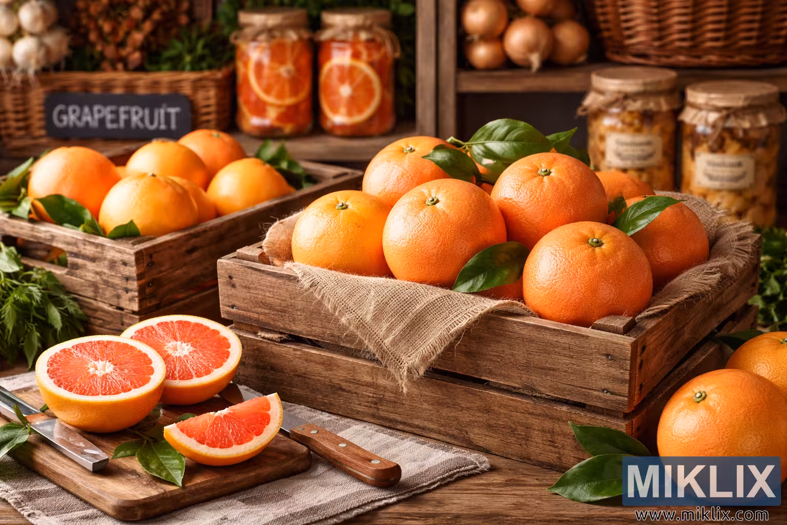 Slika prikazuje pažljivo postavljenu fotografiju pejzaža visoke rezolucije koja ilustrira najbolje prakse za dugotrajno skladištenje grejpfruta u rustikalnom okruženju nalik smočnici. U prvom planu, dvije čvrste drvene gajbe stoje na drvenoj radnoj površini, svaka obložena grubom jutom koja omogućuje protok zraka, a istovremeno ublažava udarce o plod. Gajbe su ispunjene cijelim grejpfrutima koji izgledaju svježe ubrano, njihove kore su glatke, napete i ravnomjerno obojene u toplim nijansama narančaste s suptilnim ružičastim podtonovima. Nekoliko plodova zadržava sjajne zelene listove pričvršćene na kratke stabljike, vizualni znak svježine i minimalnog rukovanja. Grejpfruti su labavo složeni, a ne gusto naslagani, naglašavajući pravilan razmak kako bi se spriječilo nakupljanje modrica i vlage tijekom skladištenja. Ispred gajbi, drvena daska za rezanje drži prepolovljeni grejpfrut i krišku, otkrivajući živo rubin-crveno meso s jasno definiranim segmentima i vlažnom, sočnom teksturom. Nož s drvenom drškom leži u blizini, što sugerira pregled ili rotaciju uskladištenog voća, a ne aktivnu pripremu hrane. Izloženo meso je u snažnom kontrastu s mat korom, pojačavajući ideju o kvaliteti očuvanoj tijekom vremena. Razbacano zeleno lišće po površini dodaje prirodnu atmosferu, atmosferu farme u smočnici, bez impliciranja nereda. U sredini i pozadini, otvorene drvene police drže konzerviranu hranu u staklenkama, košare s lukom ili češnjakom i svježe začinsko bilje. Ovi elementi uokviruju grejpfrute u širi kontekst tradicionalnog skladištenja hrane, pojačavajući temu hladnog, suhog i dobro prozračenog prostora. Mala naljepnica u obliku ploče s natpisom "Grejpfrut" vidljiva je na jednoj polici, suptilno ukazujući na organizaciju i upravljanje zalihama. Rasvjeta je mekana i usmjerena, vjerojatno prirodno svjetlo ulazi s jedne strane, stvarajući nježne naglaske na kožici voća i meke sjene ispod sanduka. Ovaj izbor rasvjete poboljšava teksturu i realizam, a istovremeno sugerira hladno, stabilno okruženje, a ne oštru vrućinu ili izravnu sunčevu svjetlost. Sveukupno, slika komunicira čistoću, red i brigu, vizualno demonstrirajući kako bi se grejpfruti trebali čuvati: neomotani, suhi, dobro razmaknuti, zaštićeni prozračnim materijalima i čuvani u namjenskom skladišnom prostoru dizajniranom za dugotrajnost i očuvanje kvalitete.