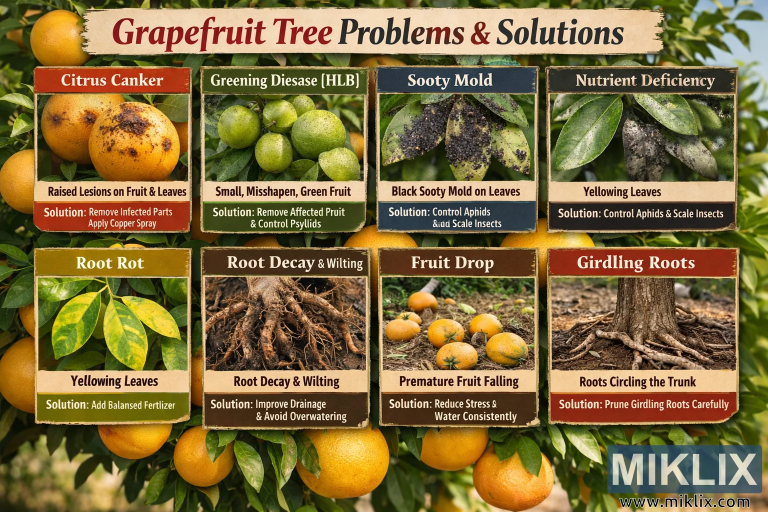 Edukativna infografika koja ilustrira uobičajene probleme stabala grejpa i njihova rješenja, uključujući rak agruma, bolest ozelenjavanja, čađavu plijesan, nedostatak hranjivih tvari, probleme s korijenjem i opadanje plodova.