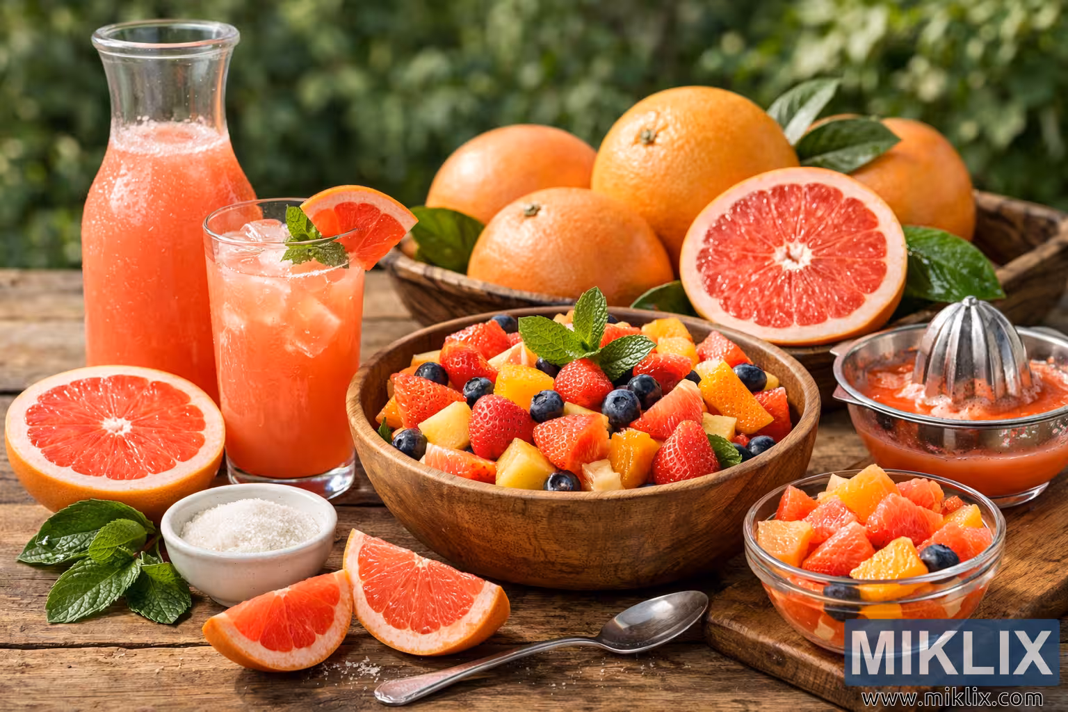 Fotografija visoke rezolucije svježe ubranih grejpfruta koji se uživaju kao sok i voćna salata na rustikalnom drvenom stolu, postavljenom na otvorenom s prirodnim svjetlom i živim bojama.