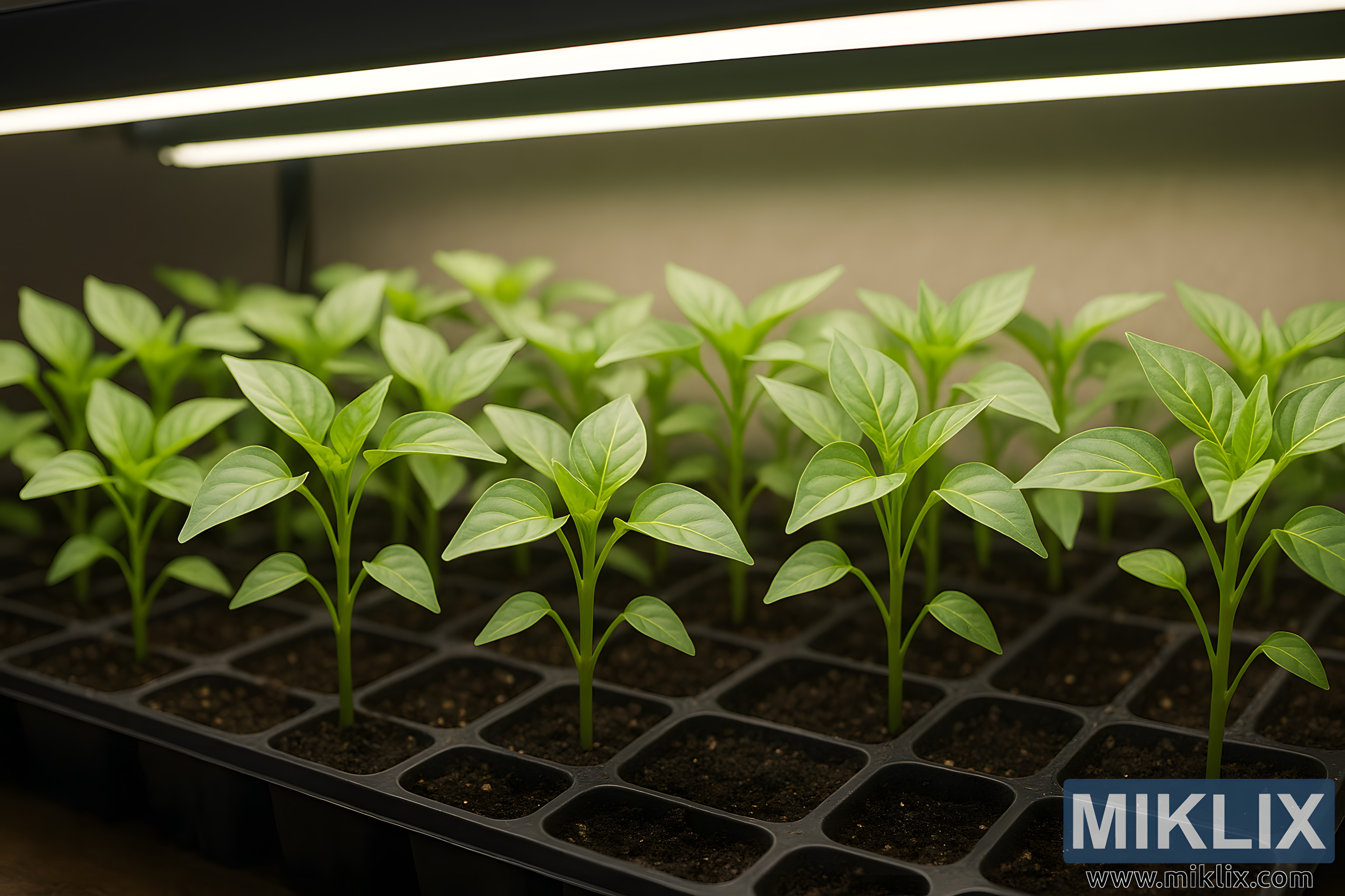 Slika prikazuje krupni plan, visoke rezolucije mladih sadnica paprike koje rastu u urednim crnim plastičnim posudama za sjeme postavljenim ispod jakih unutarnjih svjetala za uzgoj. Svaka sadnica stoji u svojoj maloj kvadratnoj ćeliji ispunjenoj tamnom, vlažnom zemljom za posude koja je u oštrom kontrastu sa živopisnom, svježom zelenom bojom listova koji se pojavljuju. Sadnice su u ranoj fazi razvoja, pokazujući vitke stabljike koje se samouvjereno uzdižu iz tla i podupiru parove glatkih, blago suženih listova. Ovi listovi pokazuju nježan uzorak žila koji postaje istaknutiji kako svjetlost prolazi preko njihovih blago sjajnih površina. Svjetla za uzgoj iznad bacaju toplo, ravnomjerno osvjetljenje na sadnice, ističući njihovu ujednačenost i zdravlje. Meki sjaj stvara suptilne sjene iza stabljika i posuda, dodajući dimenzionalnost i osjećaj dubine sceni. Redovi sadnica protežu se prema pozadini, postupno blijedeći u mekši fokus, što pojačava dojam opsežnog uzgoja u zatvorenom prostoru. Okoliš se čini čistim, stabilnim i pažljivo upravljanim, što sugerira kontrolirani uzgojni sustav koji vrtlari i hortikulturni entuzijasti često koriste za rano posađivanje paprike u sezoni. Cjelokupna kompozicija naglašava rast, red i vitalnost, obuhvaćajući obećanje svojstveno ovim malim biljkama dok se pripremaju za kasnije presađivanje u veće posude ili vanjske vrtne gredice. Osvjetljenje i jasnoća slike omogućuju da se svaki mali detalj - od zrnate teksture tla do suptilne zakrivljenosti najmlađih listova - promatra s preciznošću, dajući gledatelju osjećaj i znanstvene pažnje i prirodne ljepote. Sadnice izgledaju jednoliko zdravo, stabljike uspravne, a listovi simetrični, što ukazuje na idealne uvjete vlage, topline i osvjetljenja. Ovaj prizor prenosi i praktičnost uzgoja sjemena u zatvorenom prostoru i tiho zadovoljstvo koje proizlazi iz promatranja kako novi život pušta korijenje u pažljivo uzgojenim uvjetima.