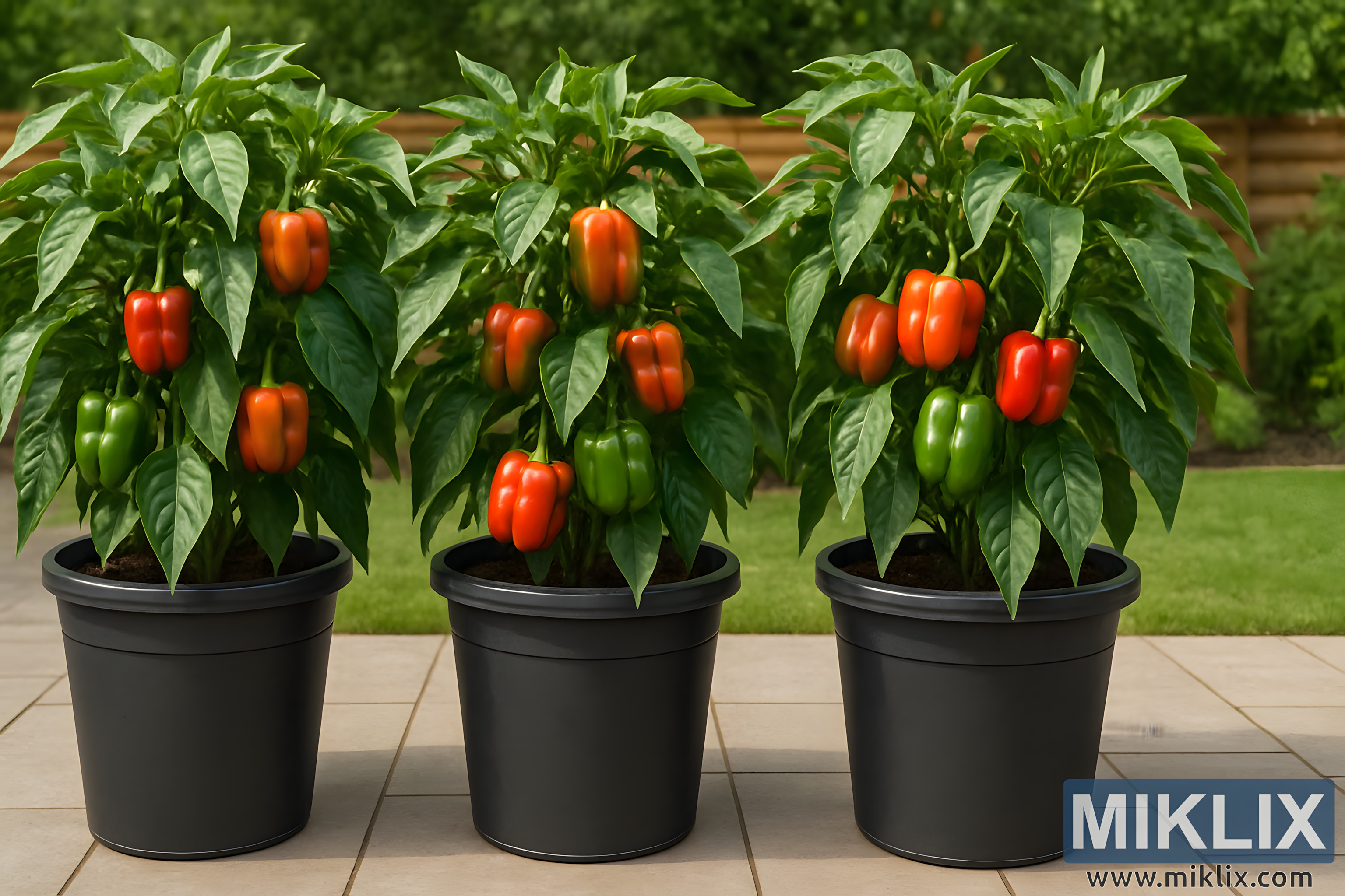Slika prikazuje svijetlo, mirno okruženje terase s tri bujne biljke paprike koje rastu u velikim, tamnosivim plastičnim posudama uredno poredanim u red. Svaka biljka je gusta s bujnim, tamnozelenim listovima koji tvore punu krošnju, ostavljajući dojam zdravog, dobro njegovanog rasta. Iz lišća izranjaju brojne paprike u različitim fazama zrelosti. Neke paprike su sjajne, jarko crvene boje, što ukazuje na punu zrelost, dok druge još uvijek prelaze kroz nijanse zelene i narančaste. Paprike teško vise s grana, a njihove glatke, kockaste površine hvataju prirodno svjetlo.