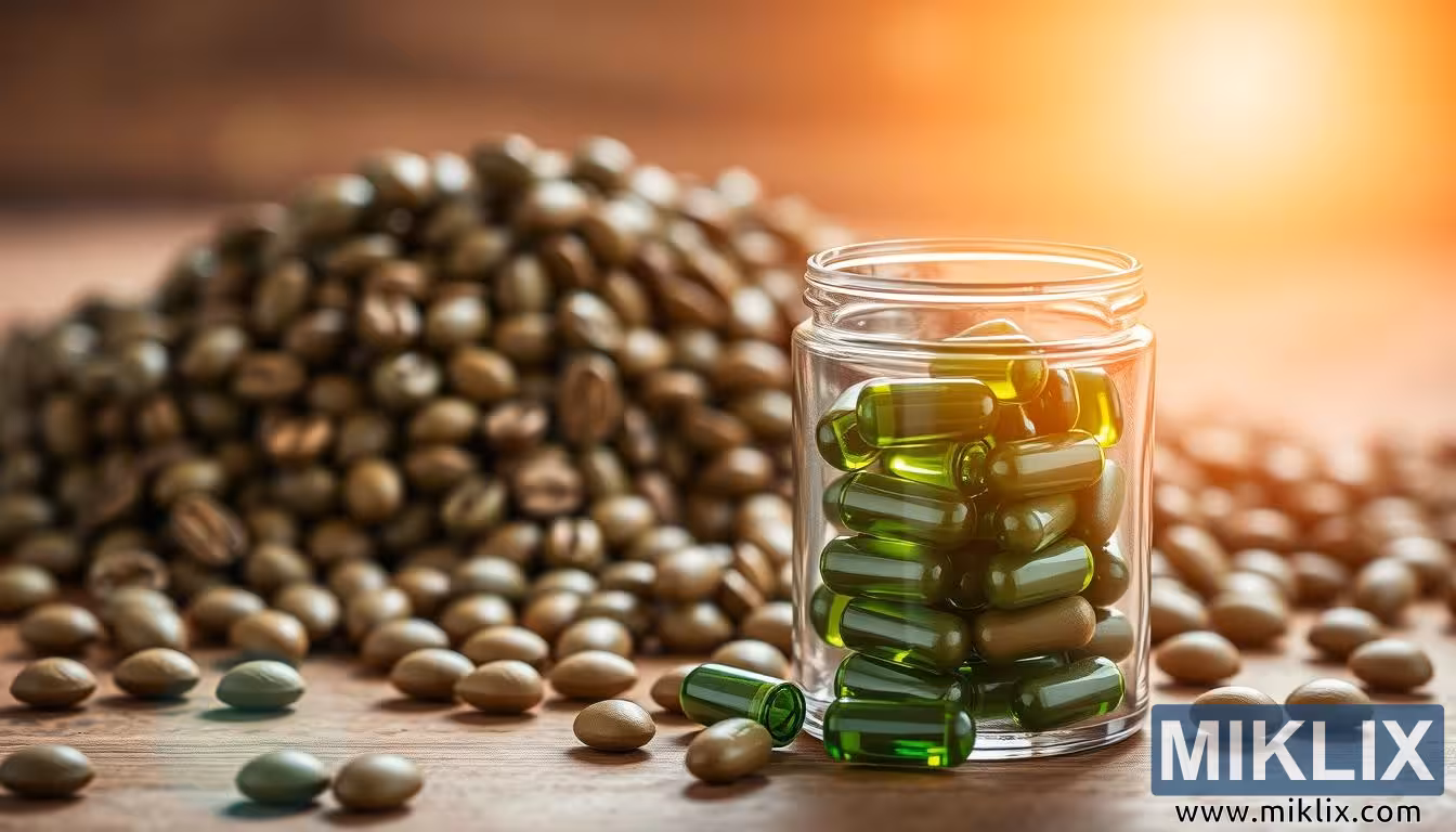 Čist krupni plan zelenih zrna kave i kapsula dodataka prehrani koji ističu njihove prirodne prednosti.