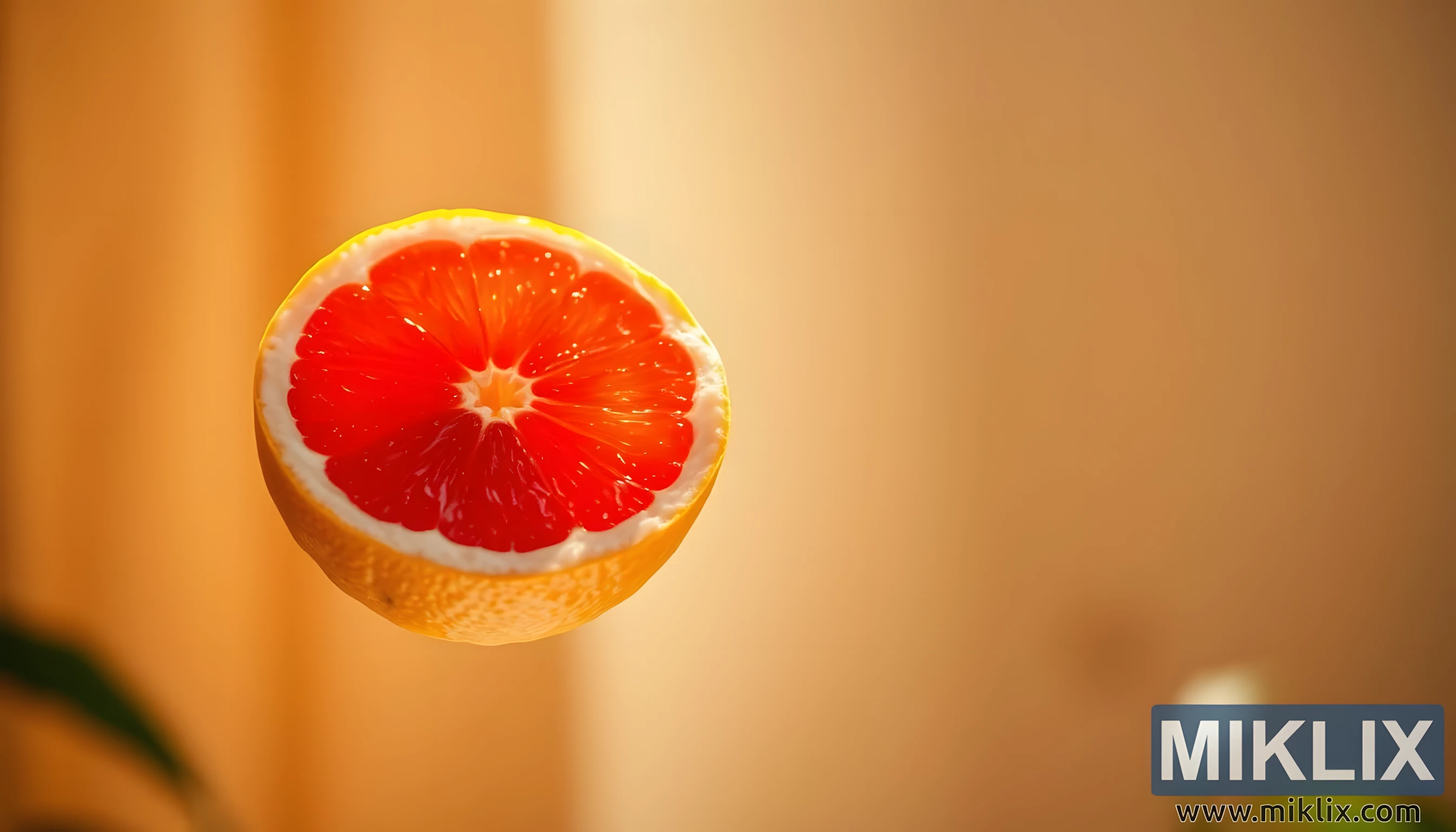 Slika predstavlja upečatljiv vizualni prikaz polovice grejpfruta, koji naizgled lebdi u zraku, a njegova jarko crvena unutrašnjost sjaji vitalnošću. Voće postaje apsolutna središnja točka kompozicije, njegovi nježni segmenti raspoređeni su u savršenoj radijalnoj simetriji, a svaki mjehurić ispunjen sokom hvata toplu svjetlost u sitnim blistavim odsjajima. Kora, zlatnožute boje s blago teksturiranom površinom, pruža kontrastni vanjski okvir koji naglašava vatrenu grimiznu boju pulpe unutra. Okupan mekim, prirodnim svjetlom, grejpfrut izgleda gotovo eterično, kao da je osvijetljen iznutra, blistavi dragulj hranjivosti koji lebdi na zamagljenoj pozadini.