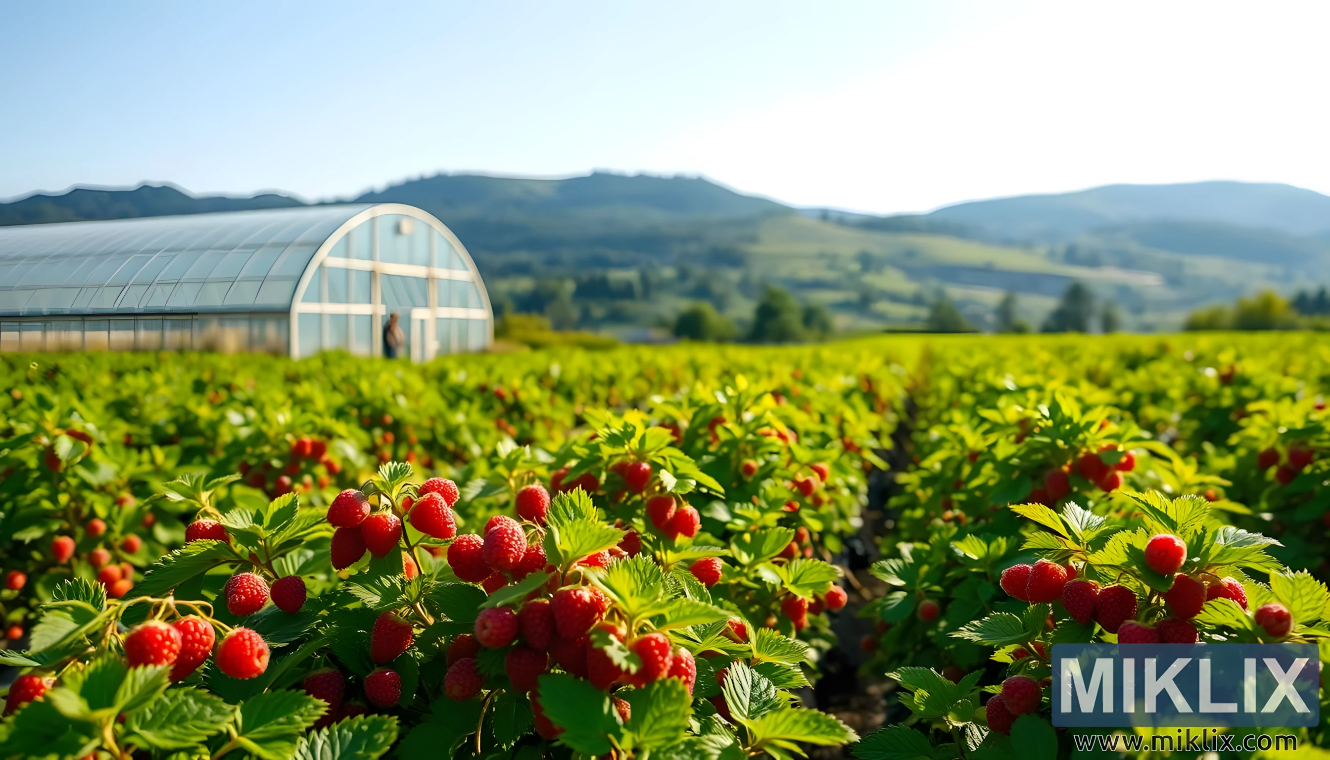Uspješna farma malina sa zrelim bobicama, poljoprivrednik koji se brine o biljkama i staklenik pod zlatnom sunčevom svjetlošću, simbolizirajući organsku i ekološki prihvatljivu poljoprivredu.