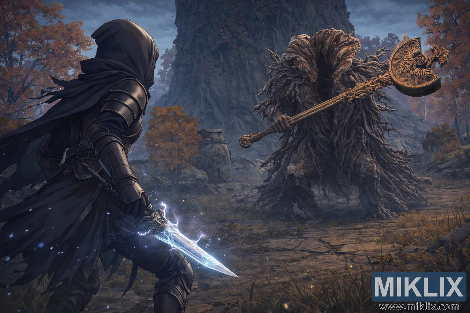 Foltossal szemben, a középpályát elfoglalva, impozáns súllyal, ott magasodik az Erdtree Avatár. A teremtmény teste csavart gyökerek, kéreg és ősi fa fúziójára hasonlít, egy hatalmas humanoid alakot alkotva, amelyet üreges, barlangszerű törzs és egy nehéz, díszes bot vagy kalapács koronáz, amelyre a szent fa ikonográfiájára emlékeztető körkörös motívumok faragtak. Testtartása óvatos, mégis domináns, mintha felmérné ellenfelét, mielőtt elsöprő erőt szabadítana fel. Az Avatár textúrája gazdagon részletezett, repedezett kéregfelületekkel, göcsörtös indákkal és mohaszerű kinövésekkel, amelyek egyszerre utalnak korra és hatalmas tartósságra.