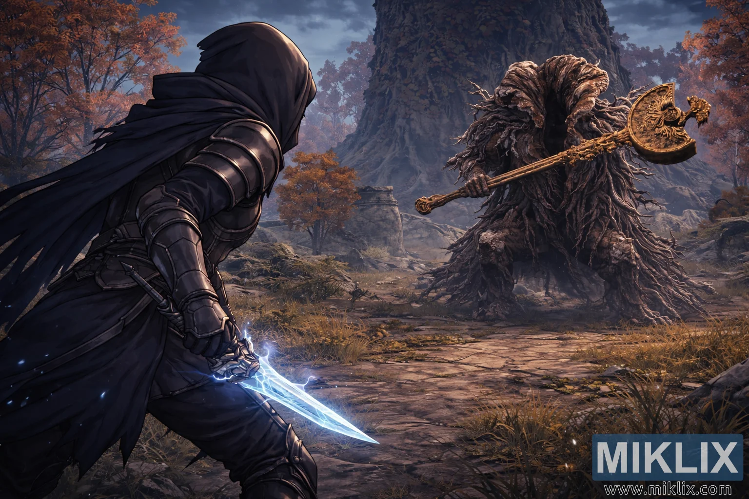 Környező környezet elmélyíti a várakozás hangulatát. A Könnyező-félsziget a háttérben terül el, tompa kék és szürke felhőkből álló, visszafogott ég alatt, lágy, szórt fényt vetve a jelenetre. Élénk narancssárga és rozsdaszínű levelű őszi fák keretezik a csatateret, meleg kontrasztot alkotva a Tarnished páncéljának és izzó fegyverének hűvösebb tónusaival. Szétszórt romok – törött kőoszlopok, viharvert falak és ősi építészeti töredékek – tarkítják a tájat, utalva egy egykor szent civilizációra, amelyet az idő és a természet visszahódított. Magas fűszálak, lehullott levelek és a levegőben szálló finom arany porszemek mozgást és életet adnak a helyszínhez anélkül, hogy megzavarnák a patthelyzet nyugalmát.