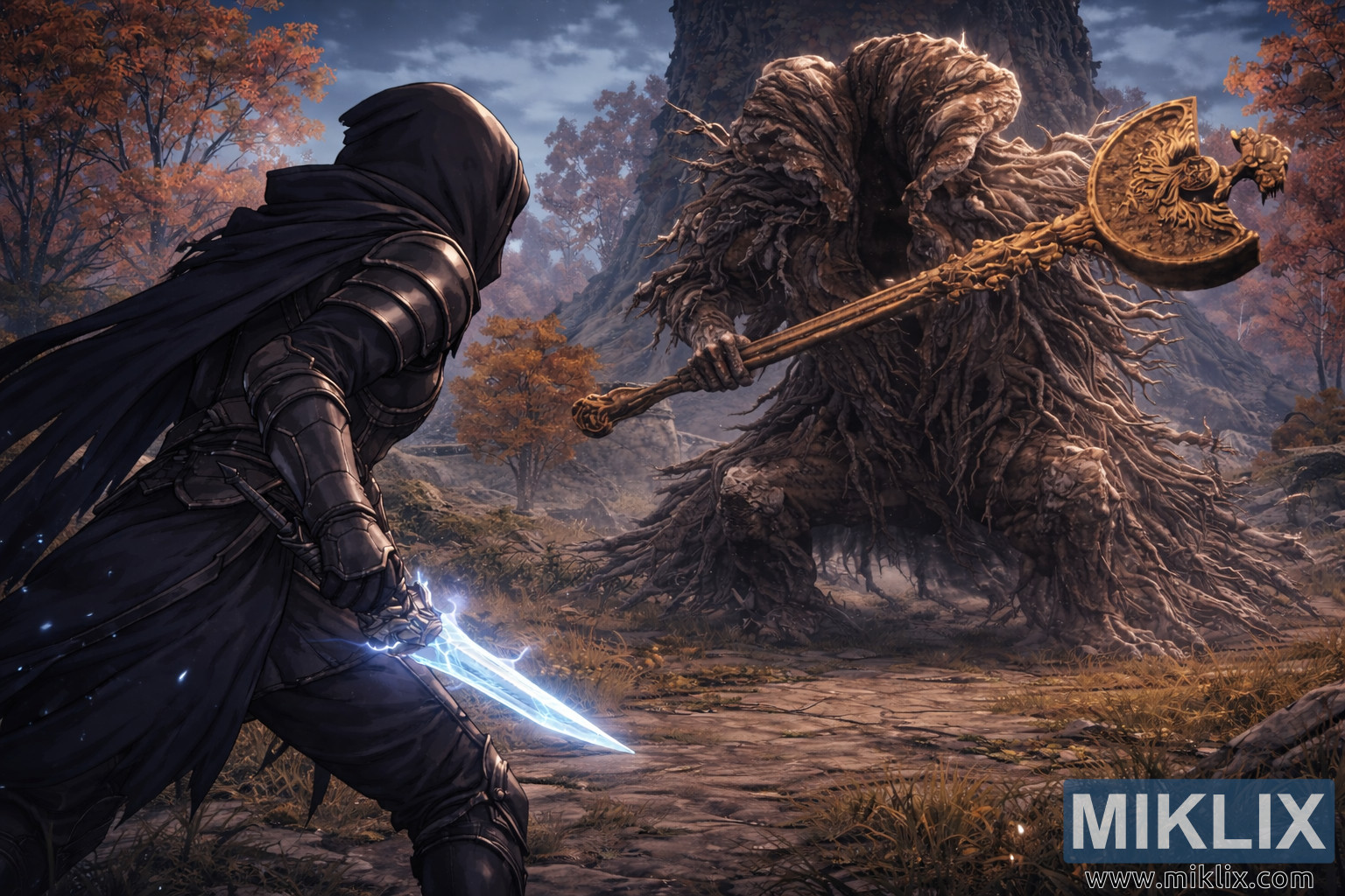 Csatatér fölé magasodik az Erdtree Avatár, akit most jelentősen nagyobbnak és impozánsabbnak ábrázolnak, mint korábban. Masszív alakja kitölti a kép jobb és középső részének nagy részét, puszta méreteivel eltörpülve a Tarnished mellett. Az Avatár teste ősi gyökerekből és kéregből faragottnak tűnik, egy hatalmas humanoid alakot alkotva, amelynek arányai szinte monumentálisnak tűnnek, mintha maga a föld kiterjesztése lenne. Vastag, kusza gyökérágak terjednek kifelé és lefelé, szilárdan rögzítve a teremtményt a földhöz. Üreges mellkasa és réteges fa textúrái kísérteties, katedrálisszerű űrt hoznak létre a közepén. Az Avatár kezében egy hatalmas, díszes botot vagy kalapácsot tart, amelyre körkörös minták és faszerű motívumok vannak faragva, amelyek az Erdtree erejéhez kapcsolódó szent szimbolikára utalnak. A fegyver önmagában majdnem akkora, mint a Tarnished, ami tovább hangsúlyozza a két alak közötti egyensúlyhiányt.