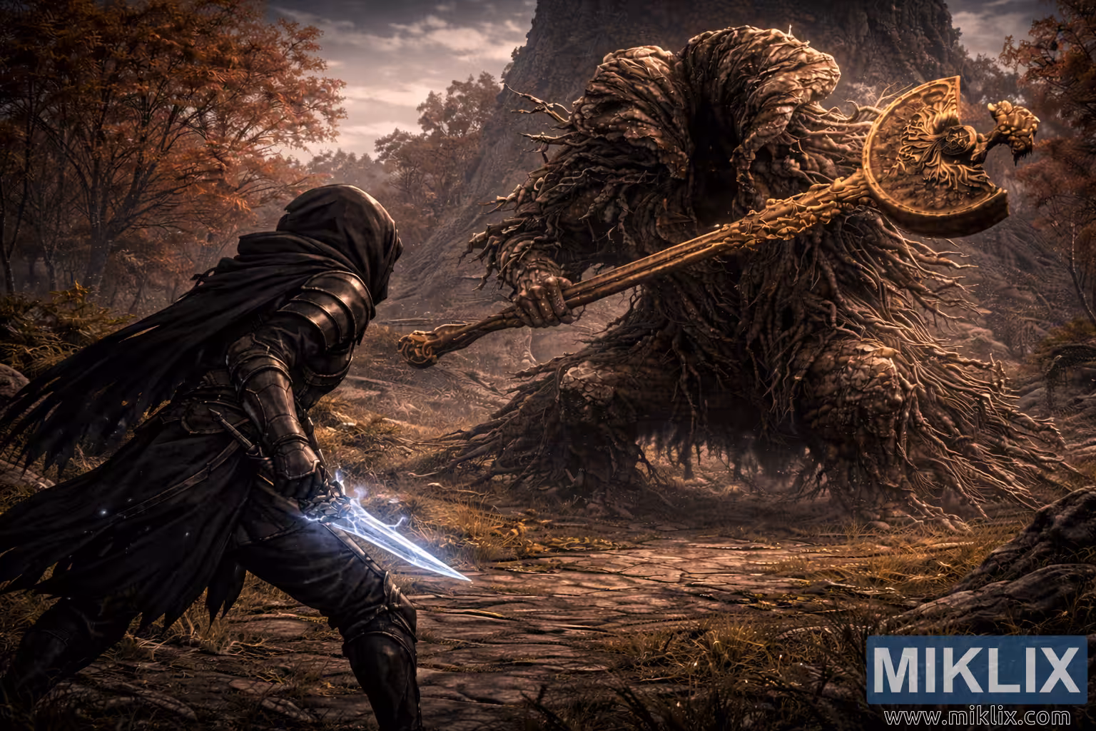 Kép: Tarnished Versus the Erdtree Avatar – Sötét fantasy patthelyzet