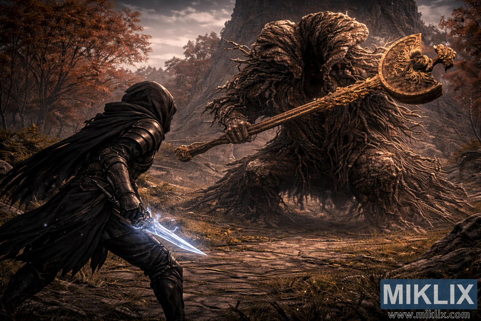 Foltos résszel szemben, a képkocka középső és jobb oldalának nagy részét kitöltve, lenyűgöző méretekben és közelségben dereng az Erdtree Avatár. A teremtmény alakja egy gyökerekből és kéregből növő ősi lényre hasonlít, teste sűrű, összefonódó falostokból áll, amelyek nehéznek, időjárás által kopottnak és mélyen texturáltnak tűnnek. Vastag, gyökérszerű végtagok nyúlnak ki a földbe, megerősítve azt a benyomást, hogy az Avatár egyszerre őrző és a táj kiterjesztése. Üreges törzse sötét, barlangszerű űrt alkot, amely egy évszázadok óta növő természetes szentélyre emlékeztet. Kezében az Avatár egy hatalmas, díszes botot vagy kalapácsot tart, amelyre körkörös emblémák és faszerű motívumok vannak vésve, a fémes felület meleg fényeket ver vissza a környezeti fényből. A fegyver átlósan nyúlik át a jeleneten, vizuálisan csökkentve a két alak közötti távolságot, és fokozva a közvetlen becsapódás érzetét.
