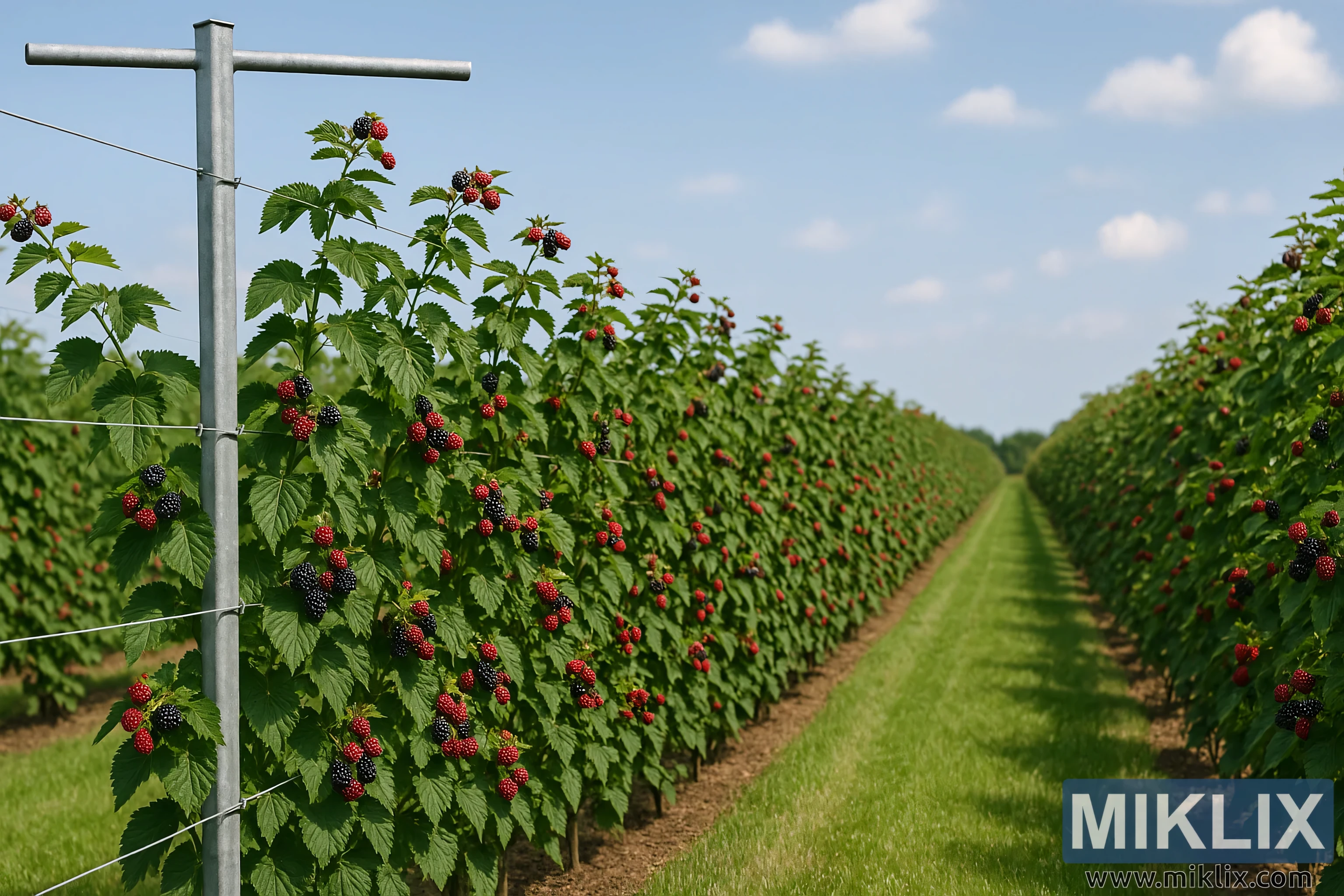 Nagy felbontású tájképfotó egy egyenesen álló szeder termesztéséhez használt T-rácsos rendszerről, amelyen a tiszta ég alatt a távolba nyúló, gyümölcsökkel teli növények buja sorai láthatók.