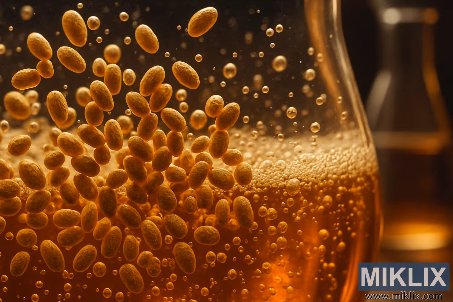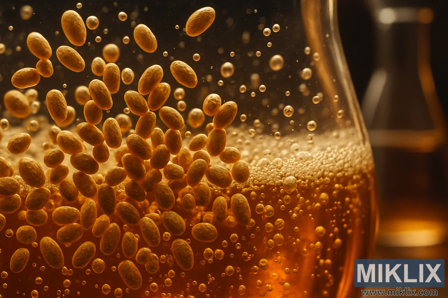 Borostyánszínű folyadékban szuszpendált sörélesztő közeli képe, felszálló buborékokkal, kiemelve az erjesztés művésziségét és precizitását.