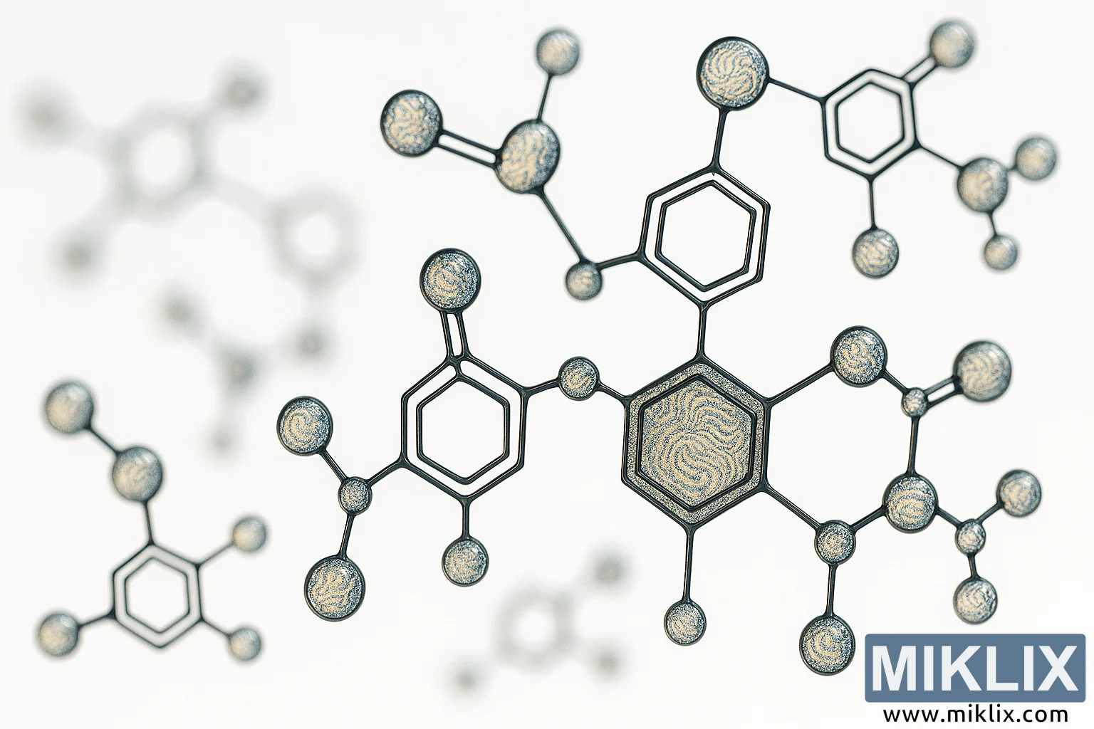Az összkép tisztaságot, a minimalizmust a világos, szinte steril háttér biztosítja, amely elkülöníti a struktúrákat és eltávolít minden zavaró tényezőt. Ez az érintetlen kontextus a tisztaságot és a kontrollt hangsúlyozza, egy modern laboratórium környezetét idézve, ahol az ilyen molekulákat tanulmányozzák és megértik. Mégis, a technikai precizitás ellenére a kép művészi hatást kelt. A gömbökön belüli örvénylő minták, valamint a gyűrűk és kötések geometrikus ismétlődése olyan ritmust teremt, amely egyszerre tudományos és esztétikus, egyesítve a kémia és a design világát.