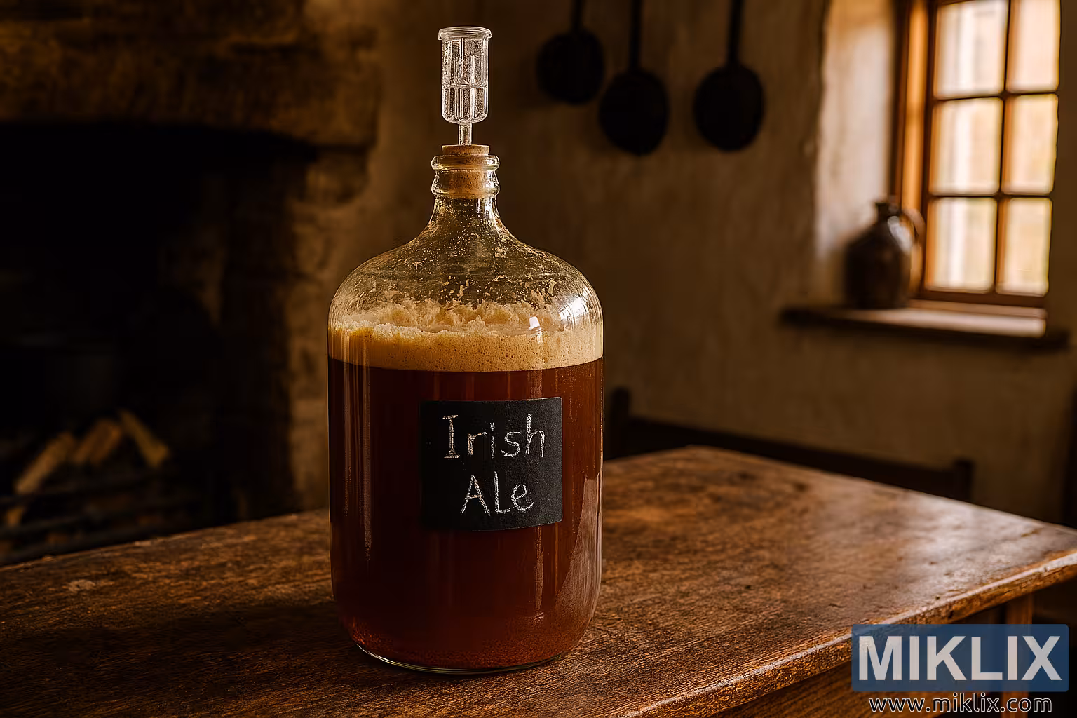 Ez a nagy felbontású tájkép a hagyományos ír házisörfőzés lényegét ragadja meg egy részletgazdag jeleneten keresztül, melynek középpontjában egy erjedő ír sörrel töltött üvegballon áll. A vastag, átlátszó üvegből készült ballon kiemelkedően áll egy viharvert faasztalon, mély erezetmintákkal, karcolásokkal és meleg patinával, amely az évek használatáról árulkodik. Az edény mély borostyánszínű sörrel van töltve, színe a rozsdabarnától a mahagóniig terjed, tetejét pedig egy habos krausen réteg borítja – bézs és törtfehér hab tapad a belső falakhoz, és egy gyűrű alakú maradékot képez, amely jelzi az erjedés előrehaladását. Az elején egy kis fekete krétatáblás címke található, amelyen fehér krétával az „Irish Ale” felirat olvasható, személyes és kézműves jelleget kölcsönözve a képnek.