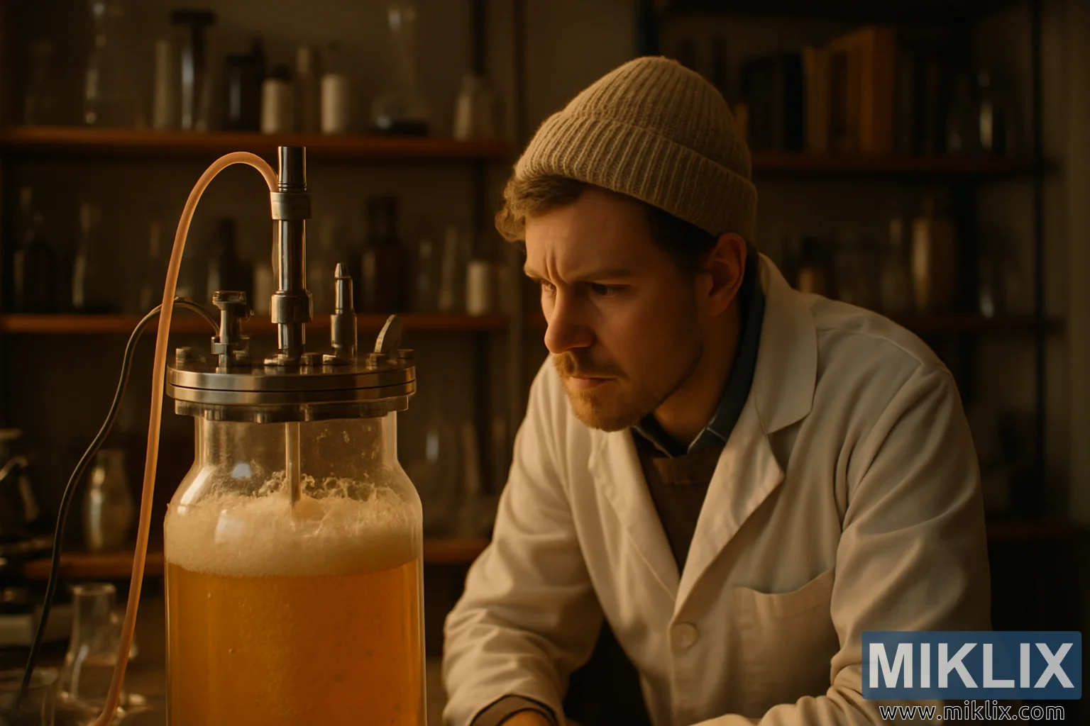 Egy meleg, hangulatos laboratóriumi jelenet, melyben egy technikus egy bugyborékoló erjesztőedényt figyel, körülötte sörfőző eszközök és tudományos felszerelésekkel teli polcok.