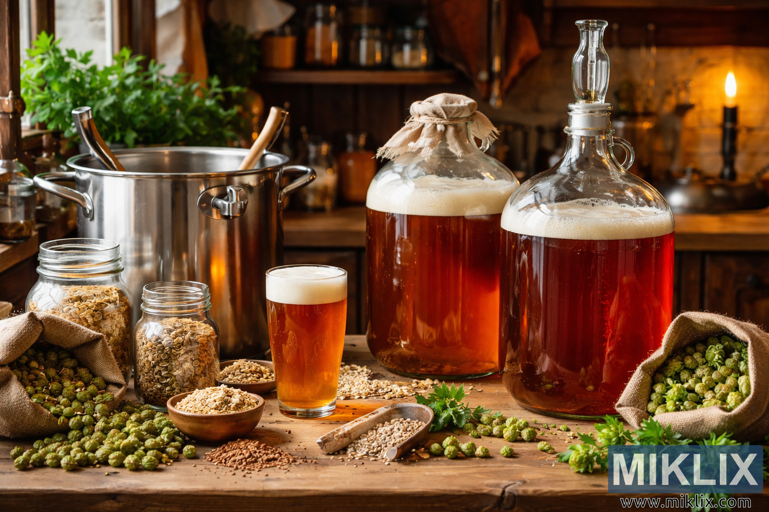 Nagy felbontású kép egy rusztikus házisörfőzde berendezéséről, melyen üvegkannákban erjedő sör, friss komló, gabonafélék, sörfőző eszközök és meleg, kézműves konyhai hangulat uralkodik.