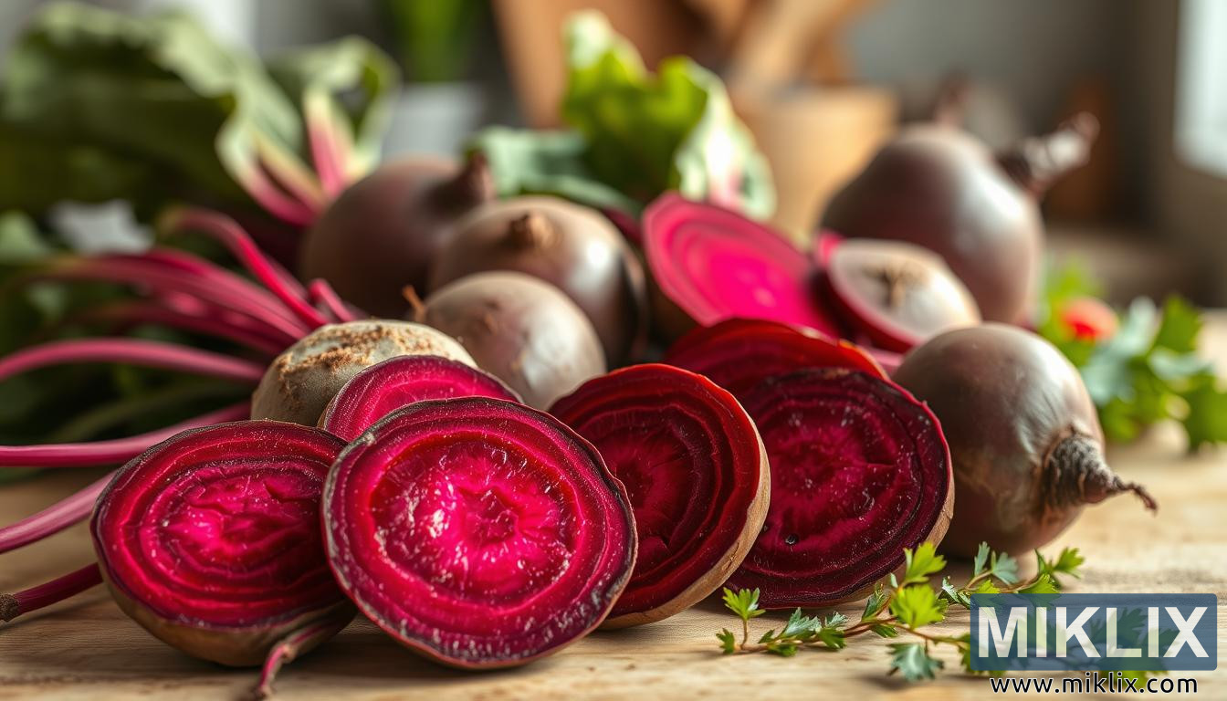 Կենսունակ ճակնդեղ՝ ամբողջական և կտրատած, հյութալի կարմրավուն ներքին շերտով՝ տաք լույսի ներքո, որը ընդգծում է դրանց հողային կենսունակությունը և բնական մարսողական առողջության համար օգտակար հատկությունները։