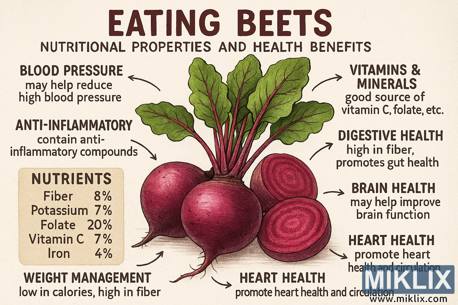 Այս պատկերը իդեալական է կրթական, խոհարարական և առողջապահական համատեքստերի համար, տալով տեսողականորեն գրավիչ և տեղեկատվական պատկերացում այն մասին, թե ինչու է ճակնդեղը արժեքավոր լրացում առողջ սննդակարգին։