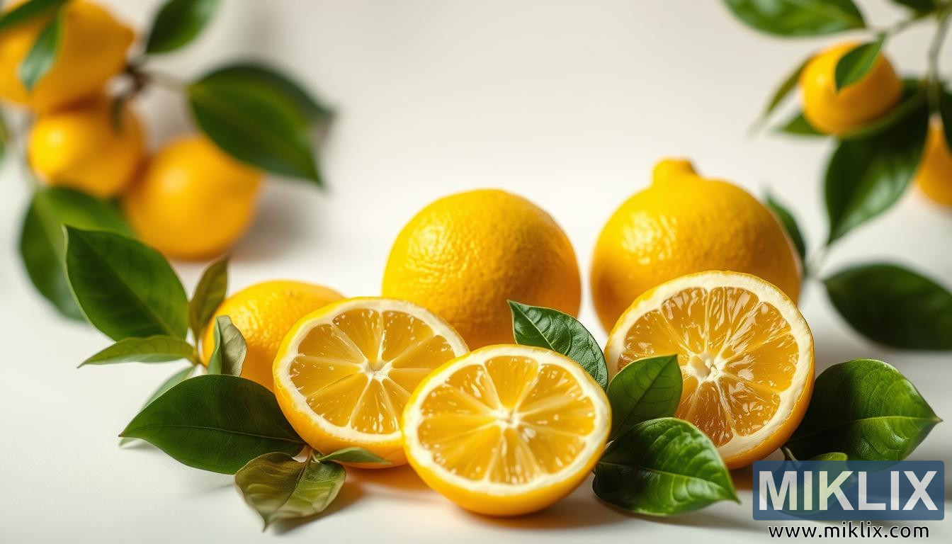 Ամբողջական և կտրատած կիտրոնների նատյուրմորտ տերևներով՝ մեղմ լուսավորության տակ, որը ընդգծում է դրանց վիտամին C-ի հարստությունը, իմունային համակարգը խթանող ուժը և թարմ կենսունակությունը։