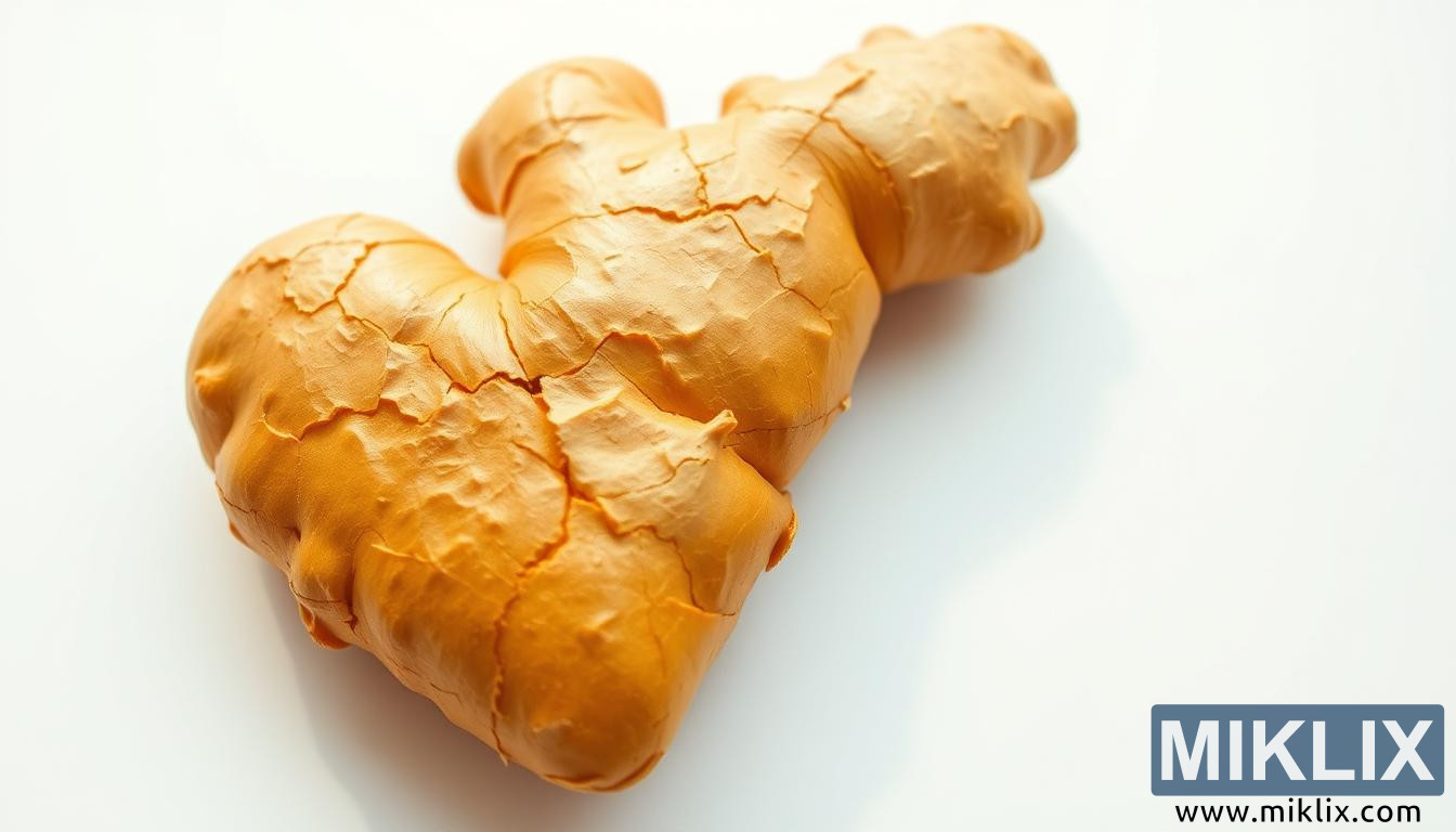 Սպիտակ մակերեսի վրա սրտաձև կոճապղպեղի արմատի խոշորացված պատկեր՝ ոսկեգույն երանգներով, որը խորհրդանշում է կոճապղպեղի մաքրությունը և դրա օգտակար հատկությունները սրտանոթային առողջության համար: