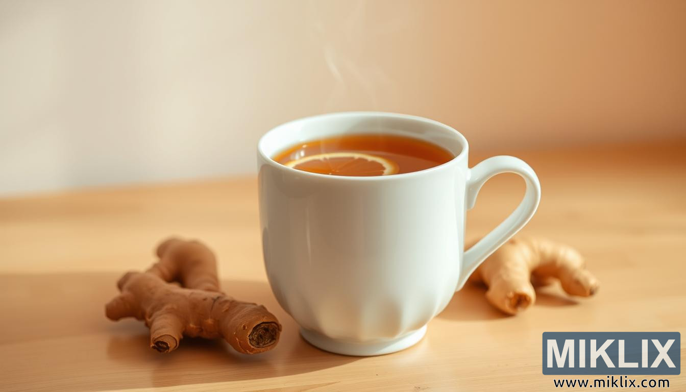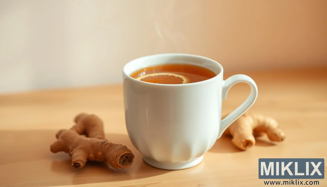 Թեժ բաժակ իմբիրի թեյ՝ մեղմ լույսի ներքո լողացող կտորներով, որը խորհրդանշում է հանգստությունը, բարեկեցությունը և այս ըմպելիքի վերականգնողական առողջական օգուտները։