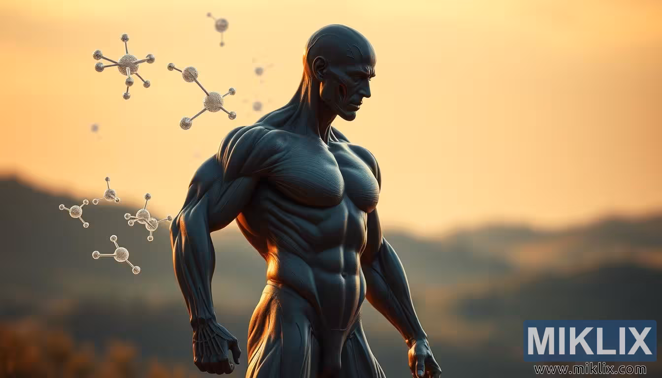 Այս պատկերը արտացոլում է գիտության, ուժի և խորհրդանիշի դրամատիկ միաձուլումը՝ պատկերելով գլիցինը ոչ թե որպես վերացական մոլեկուլ, այլ որպես մարդկային կենսունակության կառուցման և պահպանման էական ուժ: Կենտրոնում կանգնած է քանդակված, մկանուտ կերպար, որը դիրքավորված է ոսկե հորիզոնի ֆոնի վրա հանգիստ վճռականությամբ: Մարմինը ներկայացված է ակնառու անատոմիական մանրամասնությամբ, որտեղ յուրաքանչյուր մկանային խումբ սահմանվում և լուսավորվում է մայր մտնող արևի տաք, թույլ լույսով: Ստվերները փորագրում են կերպարի ձևը՝ ընդգծելով ուժն ու համաչափությունը, մինչդեռ լույսը սահում է կրծքավանդակի, ուսերի և ձեռքերի ուրվագծերի վրայով՝ ստեղծելով ուժի և նրբագեղության դինամիկ փոխազդեցություն: Ֆիգուրայի դիրքը՝ մի փոքր կախ գլուխը և թուլացած բռունցքները, փոխանցում է ոչ թե ագրեսիա, այլ դիմացկունություն, հավասարակշռությունից և ներքին տոկունությունից ծնված լուռ վստահություն: