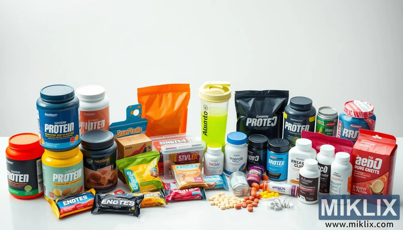 Ժամանակակից սեղանին դրված սպիտակուցային փոշիների, էներգետիկ բատոնների և հավելումների լավ լուսավորված լուսանկար, որը ընդգծում է դրանց բազմազանությունն ու գրավչությունը։
