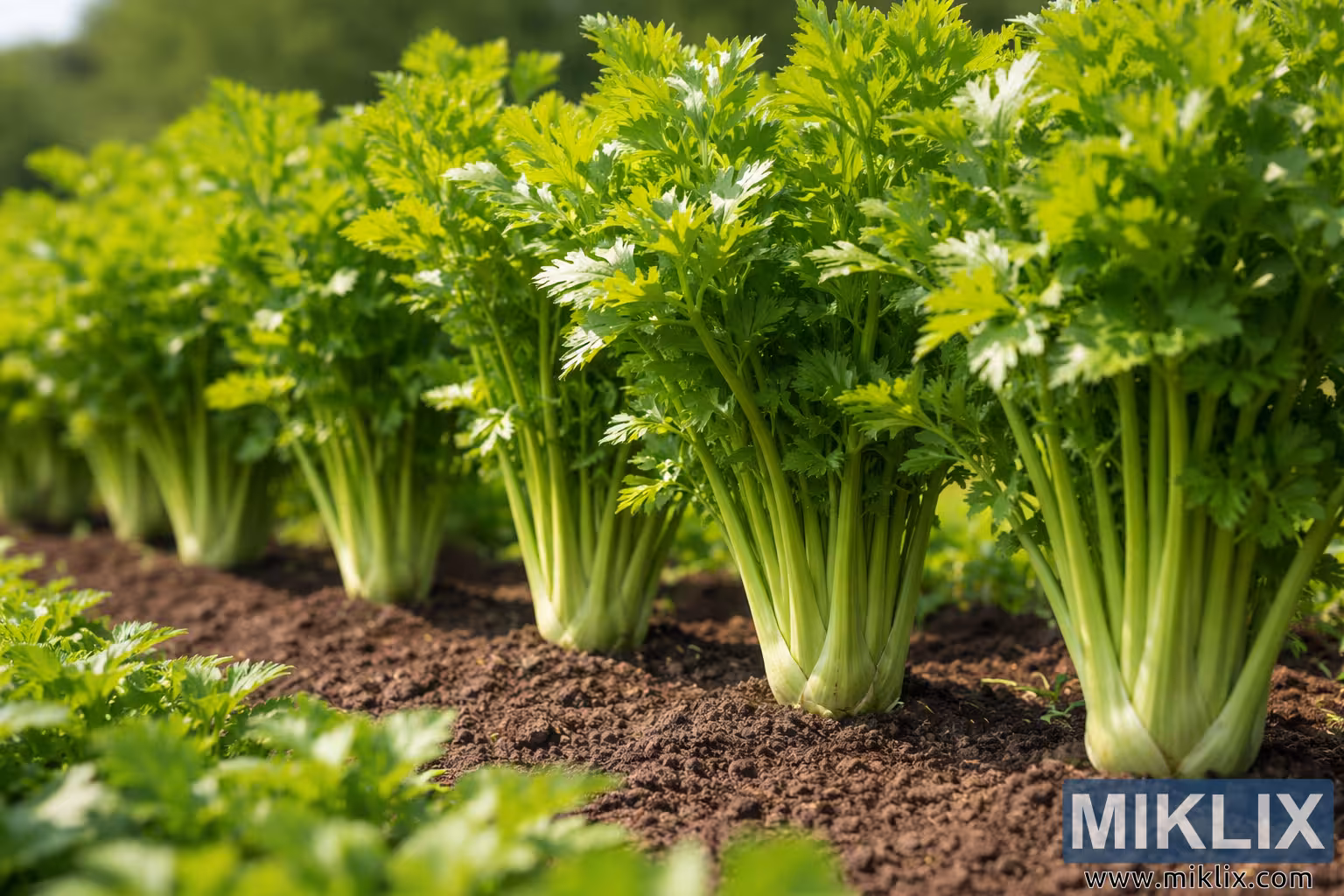 Նկարում պատկերված է թարմ նեխուրի բույսերի փարթամ, առողջ շարք, որոնք աճում են մշակովի այգում՝ բնական լույսի ներքո: Նեխուրի յուրաքանչյուր բույս աճում է հարուստ, մուգ, նուրբ կառուցվածքով հողից, ինչը վկայում է զգույշ նախապատրաստման և խոնավության լավ պահպանման մասին: Բույսերը հավասարաչափ տարածված են ուղիղ շարքով, ինչը շեշտում է կանոնավոր գյուղատնտեսական գործելակերպը և միտումնավոր տնկումը: Նեխուրի ցողունները հաստ են, ուղղահայաց և խիտ խմբավորված են իրենց հիմքերում, աստիճանաբար բաժանվելով բարձրանալուն զուգընթաց: Դրանց գույնը հողի գծի մոտ գտնվող գունատ, գրեթե կրեմագույն կանաչից անցնում է ցողունների վերևում գտնվող վառ, հագեցած կանաչի: Նեխուրի ցողունների առանձնահատուկ կողավոր կառուցվածքը հստակ տեսանելի է՝ հարթ, բայց ամուր մակերեսներով, որոնք ենթադրում են թարմություն և ճռճռանություն: Ցողունների վերևում, դեպի դուրս և վերև տարածվում են խիտ տերևավոր գագաթներ, որոնք կազմված են ատամնավոր, նուրբ տերևներից, որոնք որսում են արևի լույսը: Տերևները ցուցաբերում են կանաչ երանգների նուրբ տատանումներ՝ վառ կրաքարիից մինչև ավելի մուգ զմրուխտագույն, ինչը ավելացնում է տեսողական խորություն և ռեալիզմ: Արևի լույսը լուսավորում է բույսերը վերևից և մի փոքր կողքից՝ ստեղծելով մեղմ լուսավորումներ ցողունների վրա և նուրբ ստվերներ ներքևի հողի վրա: Ետնապատկերը աստիճանաբար մշուշվում է մեղմ կանաչ մշուշի մեջ, որը, հավանաբար, վկայում է կենտրոնական շարքից դուրս այգու ավելի շատ բուսականության մասին, ինչը ստացվում է դաշտի մակերեսային խորության շնորհիվ, որը կենտրոնացնում է ուշադրությունը կենտրոնական բույսերի վրա: Տեսանելի մոլախոտեր, վնասատուներ կամ վնասվածություն չկա, ինչը ամրապնդում է լավ պահպանված այգու և բույսերի առողջության տպավորությունը: Ընդհանուր կոմպոզիցիան փոխանցում է թարմություն, աճ և բնական առատություն, ինչը պատկերը հարմար է դարձնում այգեգործության, գյուղատնտեսության, օրգանական գյուղատնտեսության, առողջ սննդի կամ թարմ մթերքների հետ կապված թեմաների համար: Լանդշաֆտային կողմնորոշումը թույլ է տալիս նեխուրի շարքին հորիզոնականորեն տարածվել կադրի երկայնքով՝ ստեղծելով շարունակականության և մասշտաբի զգացողություն, մինչդեռ բարձր լուծաչափը արտացոլում է մանր մանրամասներ, ինչպիսիք են հողի հատիկները, տերևների երակները և բույսերի վրա նուրբ գունային գրադիենտները: