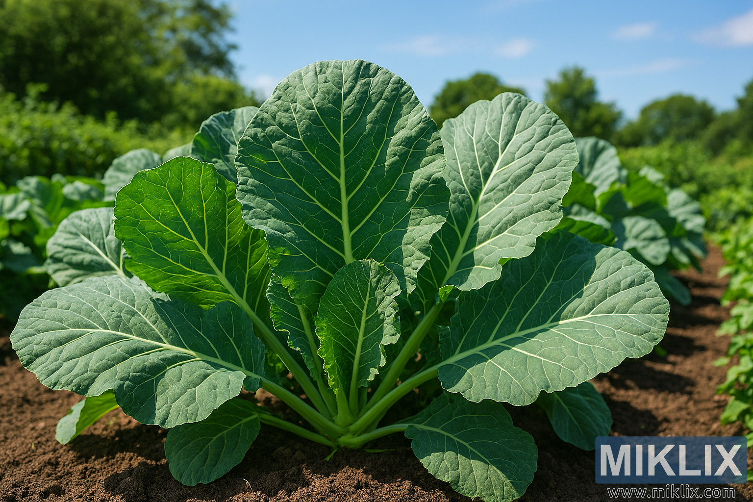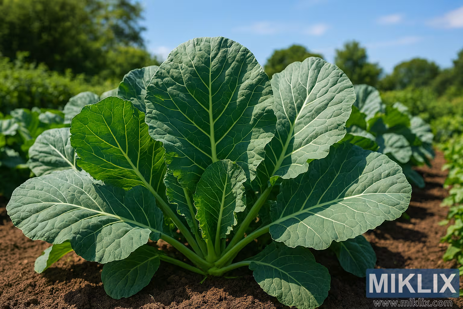 Այս բարձր թույլտվությամբ լանդշաֆտային պատկերը պատկերում է Flash տեսակի կաղամբի խոշորացված տեսարանը, որը ծաղկում է մանրակրկիտ խնամված բանջարանոցում՝ պայծառ ամառային օրը: Կոմպոզիցիան կենտրոնացած է առաջին պլանում կաղամբի բույսերի խիտ կույտի վրա, որոնց մեծ, լայն տերևները ճառագայթում են դեպի դուրս՝ հովհարաձև դասավորվածությամբ: Յուրաքանչյուր տերև վառ, մուգ կանաչ է՝ թեթևակի մոմային մակերեսով և մեղմ ալիքավոր եզրերով: Յուրաքանչյուր տերևի կենտրոնով անցնում են ակնառու բաց կանաչ միջին կողիկներ՝ ճյուղավորվելով ավելի բաց երակների ցանցի մեջ, որոնք ավելացնում են հյուսվածք և չափս: