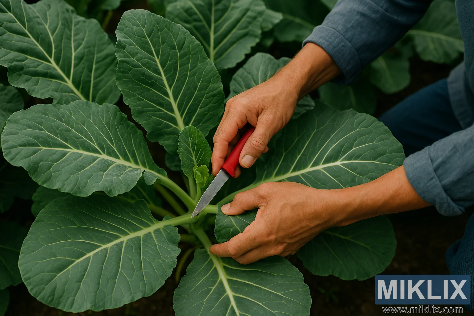 Այս բարձր թույլտվությամբ լանդշաֆտային լուսանկարում պատկերված են երկու փորձառու ձեռքեր, որոնք ծաղկող այգում հավաքում են կաղամբը։ Դարչնագույն և թեթևակի եղանակային պայմաններից տուժած ձեռքերը պատկանում են մի մարդու, որը կրում է դիմացկուն գործվածքից պատրաստված, մեղմ կապույտ երկար թևքերով վերնաշապիկ՝ թևքերի մոտ նուրբ կնճիռներով։ Ուշադրության կենտրոնում է հավաքի ճշգրիտ պահը. ձախ ձեռքը նրբորեն բռնում է հասուն կաղամբի տերևը նրա հաստ, բաց կանաչ ցողունի մոտ, մինչդեռ աջ ձեռքը բռնում է կարմիր բռնակով փոքրիկ կտրող դանակ։ Անժանգոտվող պողպատե շեղբը սուր և մաքուր է, մտցված է տերևի ցողունի հիմքում՝ զգույշ կտրվածք կատարելու համար։