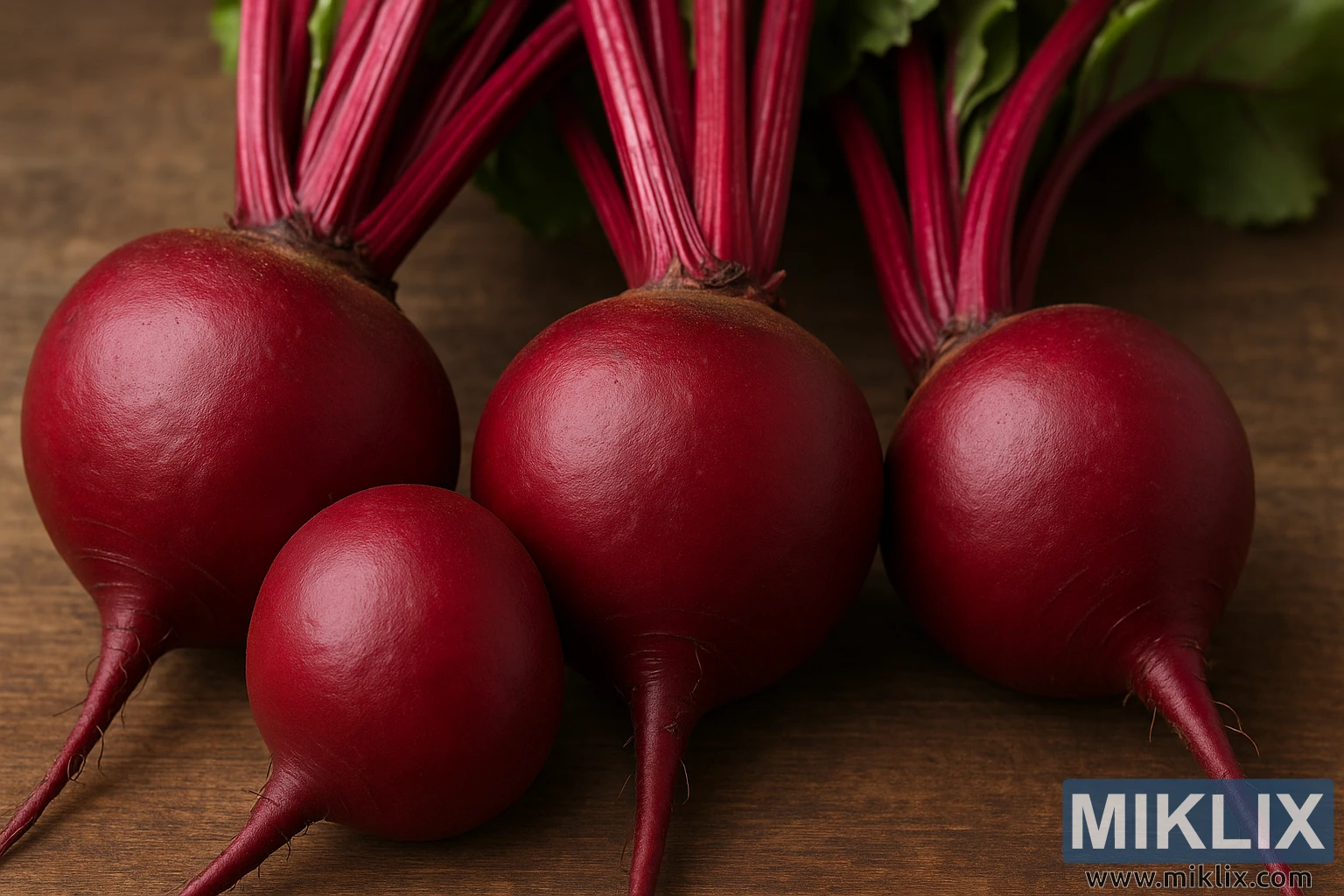 Այս բարձր թույլտվությամբ լանդշաֆտային լուսանկարը ներկայացնում է Դետրոյթի մուգ կարմիր գույնի չորս ճակնդեղների մոտիկից և մանրամասն տեսքը՝ դասավորված կողք կողքի՝ գեղջուկ փայտե մակերեսի վրա: Ճակնդեղը գերիշխում է կոմպոզիցիայում՝ լցնելով շրջանակը իրենց հարուստ երանգներով և հարթ, կլորացված ձևերով: Յուրաքանչյուր ճակնդեղ ցուցադրում է տեսակի բնորոշ խորը բորդո-կարմիր գույնը, որը գրեթե թավշյա է թվում մեղմ, ցրված լուսավորության շնորհիվ: Կեղևի հյուսվածքը նուրբ է արտահայտված. ուշադիր զննելիս տեսանելի են նուրբ բնական նշաններ, թույլ ծալքեր և նուրբ արմատային մազիկներ, որոնք բանջարեղենին հաղորդում են թարմության և իսկության զգացողություն: