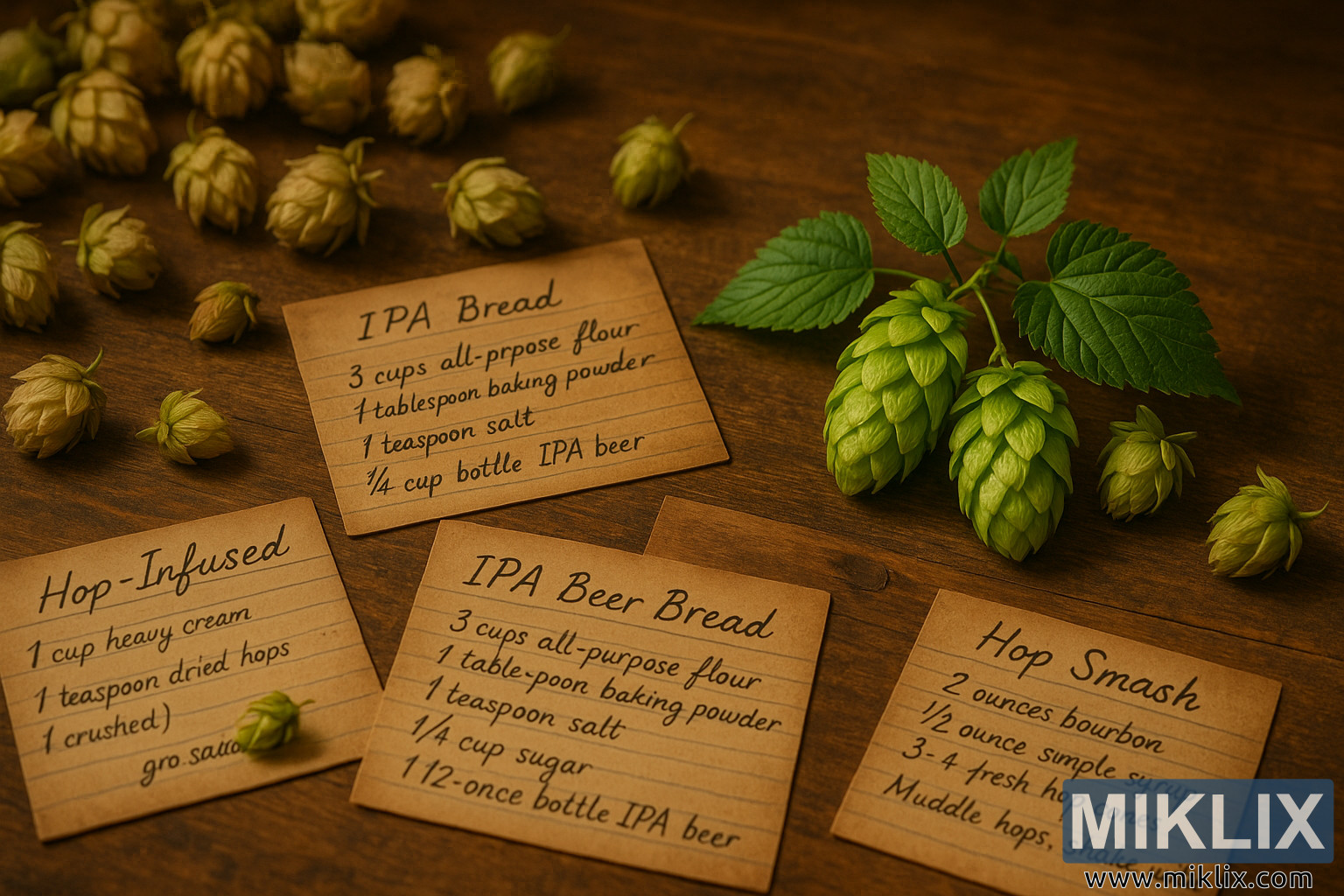 Rustic Hop Cones and Recipe Cards on Wooden Table