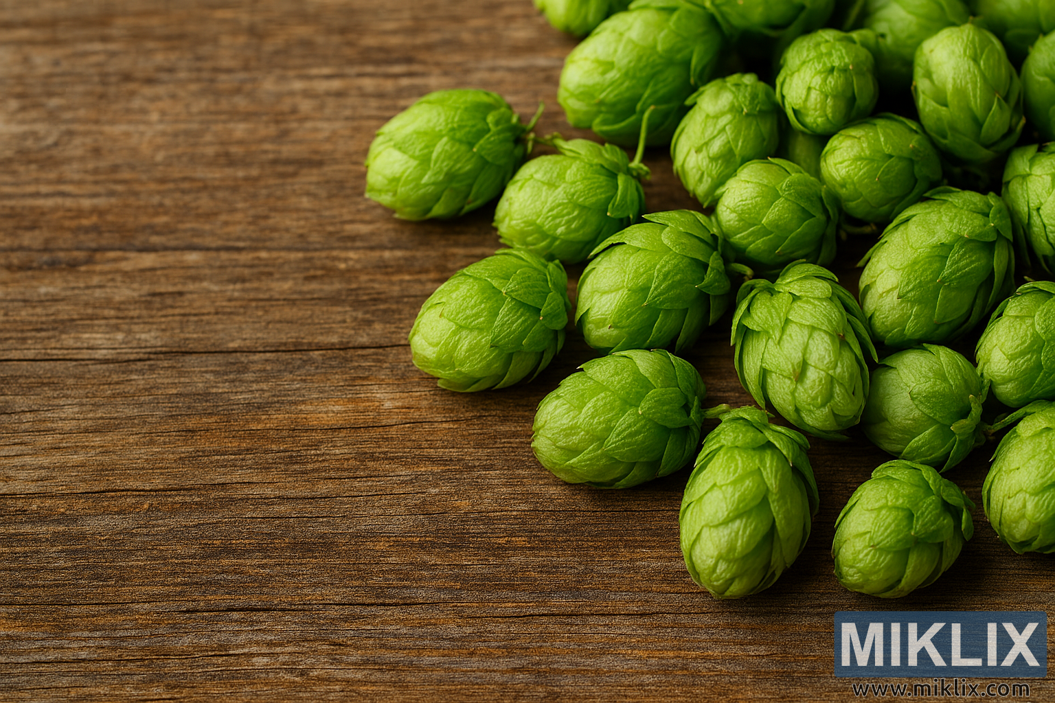 Այս բարձր թույլտվությամբ լանդշաֆտային լուսանկարը պատկերում է թարմ հավաքված Թեթնանգերի գարեջրի կոների մի խումբ, որոնք դասավորված են գեղջուկ փայտե սեղանի վրա: Գեղեջրի կոները, որոնք հայտնի են իրենց նուրբ բույրով և գերմանական ոճի գարեջրերում ավանդական օգտագործմամբ, աչքի ընկնող կերպով ցուցադրված են կադրի աջ կեսում, իսկ մի քանիսը ցրված են դեպի կենտրոն: Յուրաքանչյուր կոն կազմված է խիտ շերտավորված ծաղկաթերթիկներից, որոնք ձևավորում են վերադրվող, թեփուկավոր նախշ, որը կոներին հաղորդում է իրենց բնորոշ սոճու կոնաձև տեսքը: