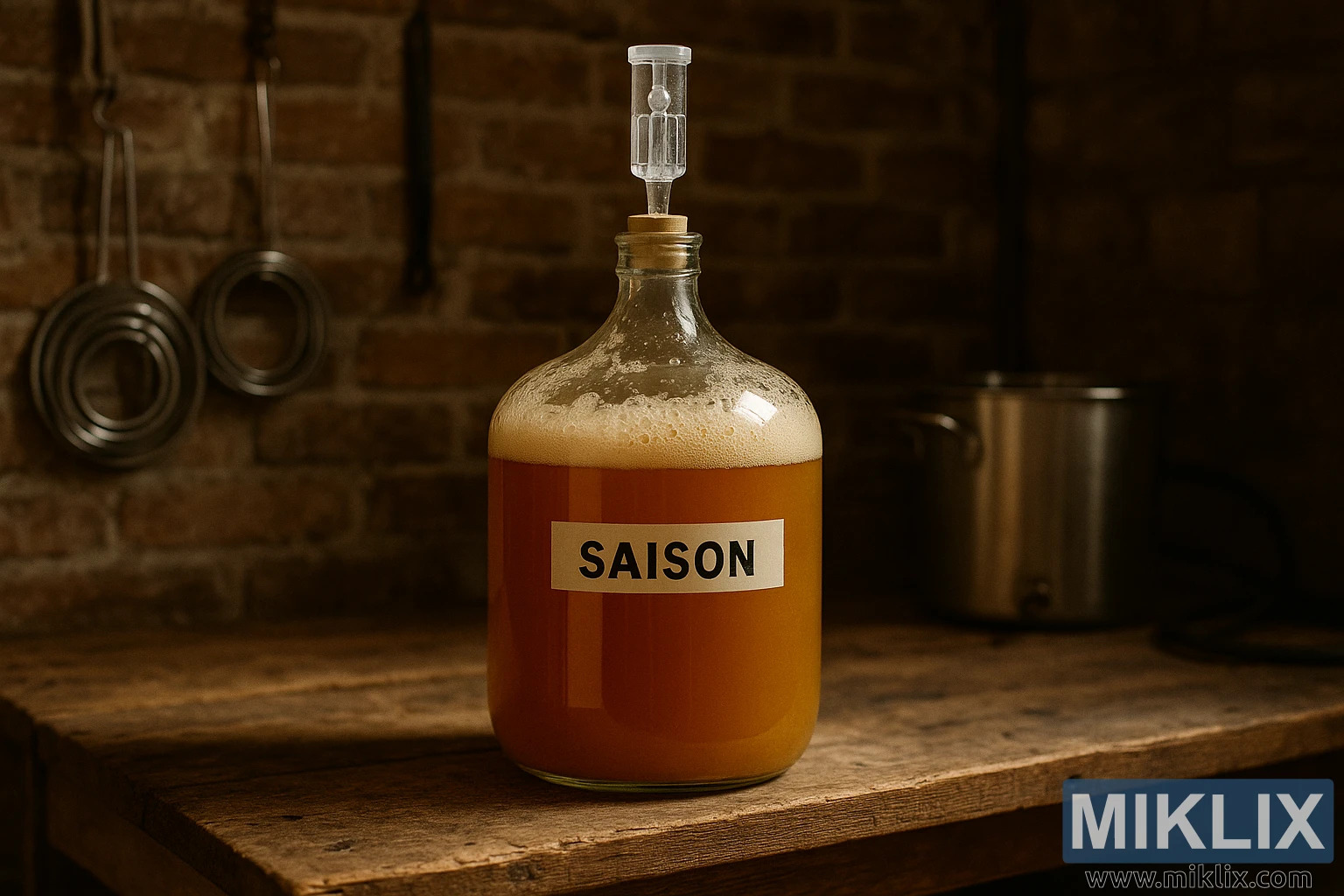 Լուսանկարում պատկերված է գեղջուկ տնական գարեջրագործական միջավայր, որտեղ ապակե խմորման ամանը, որը հայտնի է որպես կարբոյ, աչքի ընկնող տեղում է դրված մաշված փայտե աշխատանքային սեղանի վրա: Այս կարբոյը պարունակում է սեզոնային ոճի գարեջրի ակտիվ խմորման խմբաքանակ, որը ավանդաբար եփվում է արտահայտիչ խմորիչների շտամներով, որոնք հայտնի են իրենց մրգային և համեմված բնույթով: Անոթը գրեթե լի է մշուշոտ ոսկեգույն-սաթ հեղուկով, որը ծածկված է խիտ և կենսուրախ կրաուզենով՝ խմորման գործընթացի ընթացքում խմորիչի ակտիվության արդյունքում առաջացող փրփրուն գլխիկով: Հեղուկի գծից մի փոքր վերև բարձրացող այս փրփրուն շերտը ենթադրում է, որ խմորումը եռանդուն և շարունակական է, փոքրիկ փուչիկները վերև են մղվում՝ ստեղծելով անընդհատ փոփոխվող հյուսվածք, որը վկայում է ներսում գտնվող գարեջրի կենդանի, դինամիկ բնույթի մասին: