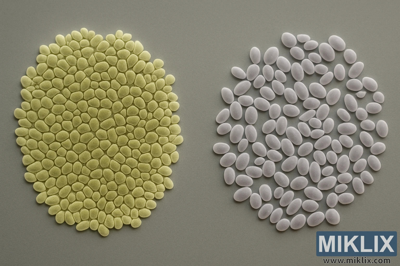 Պատկերը բարձր թույլտվությամբ, լանդշաֆտային կողմնորոշմամբ ֆոտոմիկրոգրաֆիայի ոճով պատկեր է երկու տարբեր խմորիչների գաղութների, որոնք ներկայացված են կողք կողքի՝ համեմատության համար: Մաքուր, չեզոք մոխրագույն ֆոնը ստեղծում է հանգիստ, վերահսկվող երանգ՝ վերացնելով տեսողական շեղումները և ապահովելով, որ դիտողի ուշադրությունը մնա բացառապես խմորիչների նմուշների վրա: Լուսավորությունը մեղմ է և ցրված՝ ստեղծելով կլինիկական մթնոլորտ, որը հիշեցնում է գիտական նպատակներով ստուդիական լուսանկարչություն, բայց բավարար ջերմությամբ՝ հյուսվածքն ու նուրբ տատանումները ընդգծելու համար:
