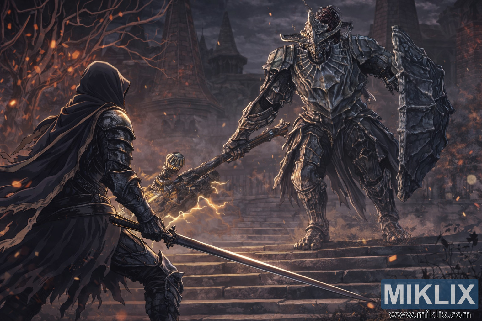 Բարձր թույլտվությամբ անիմեից ոգեշնչված Dark Souls III խաղի երկրպագուների արվեստը ցույց է տալիս Ashen One-ին, որը բախվում է Dragonslayer զրահի հետ՝ մութ գոթական լանդշաֆտի մեջ լարված նախամարտում։