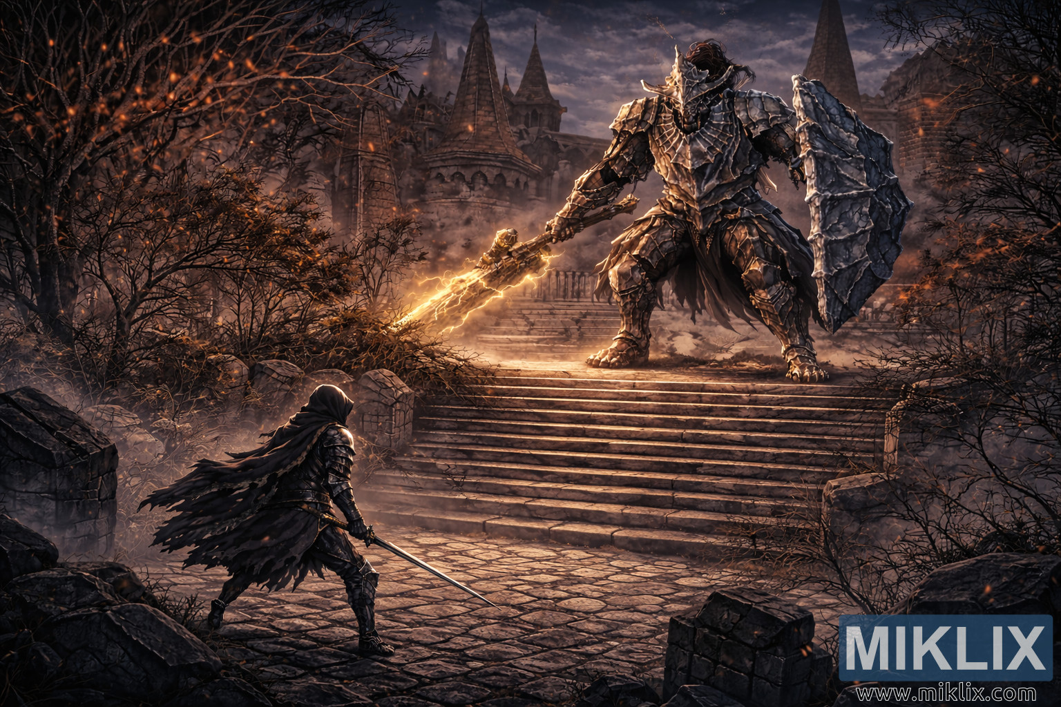 Բարձր թույլտվությամբ անիմեից ոգեշնչված մութ ֆանտազիայի նկարազարդում, որը ցույց է տալիս իզոմետրիկ նախամարտական դիմակայություն միայնակ ստվերում գտնվող զինվորի և հսկայական զրահապատ պետի միջև գոթական ավերակներում։