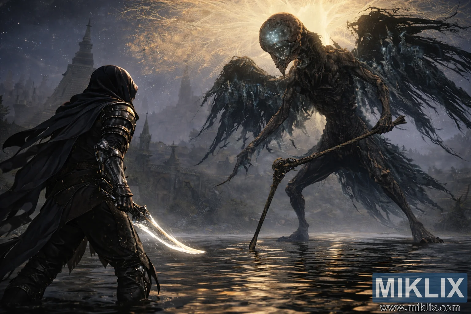 Բարձր մանրամասնությամբ մութ ֆանտաստիկ «Էլդեն Ռինգ» մուլտֆիլմի երկրպագուների արվեստը պատկերում է իրատեսական, չարագուշակ դիմակայությունը Թարնվածների և հսկայական «Մահվան ծես» թռչունի միջև Ակադեմիական Գեյթ Թաունում։