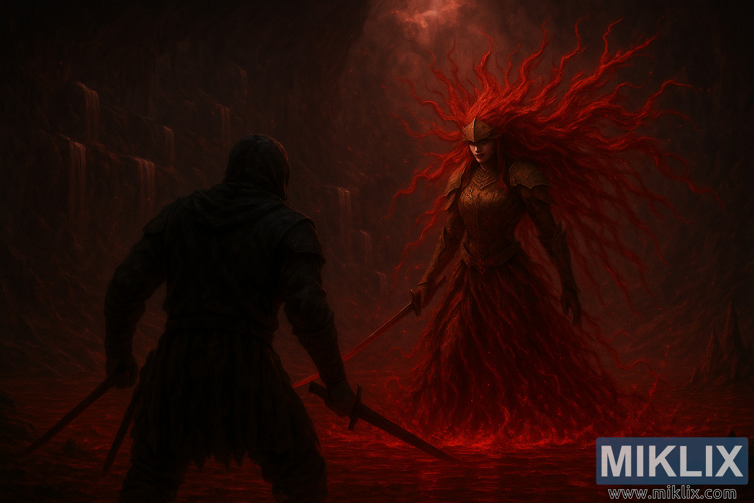 Էլդեն Ռինգի դրամատիկ երկրպագուների արվեստի տեսարան, որտեղ պատկերված է Մալենիան՝ Միքելլայի Բլեյդը, որը ստվերոտ ստորգետնյա քարանձավում կռվում է Սև դանակով մարդասպանի դեմ։