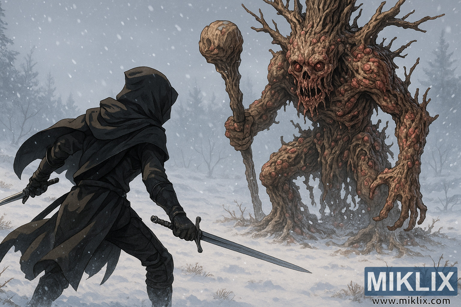 Երկու սուր ձեռքին զրահապատ զինվորը ձնաբքի ժամանակ բախվում է անճոռնի, փտող ծառի հրեշի հետ՝ Սրբագործված Ձյունե դաշտում։