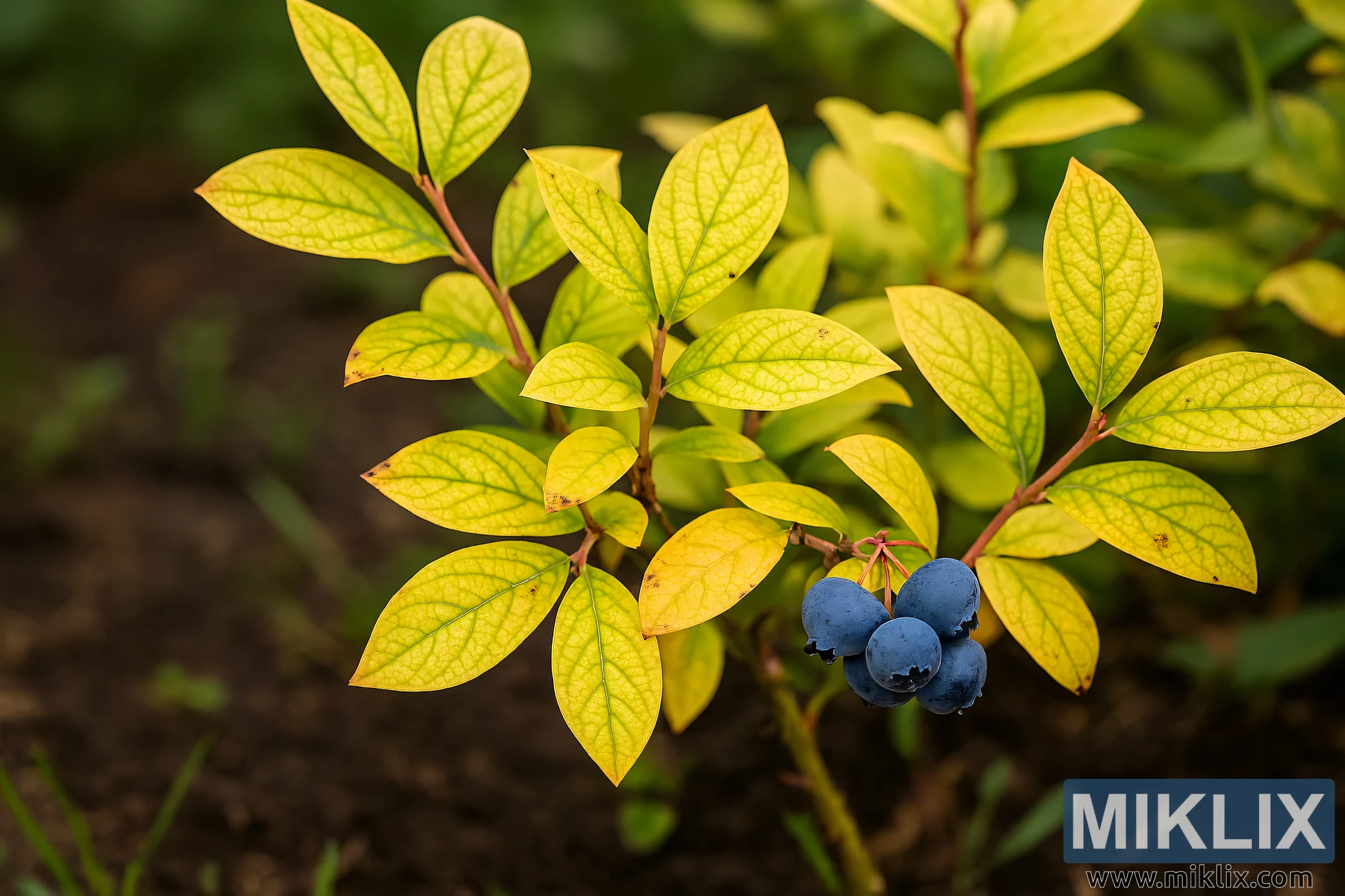 Gambar beresolusi tinggi dari semak blueberry yang menunjukkan tanda-tanda klorosis, dengan daun berurat kuning dan buah beri matang di lingkungan taman alami.