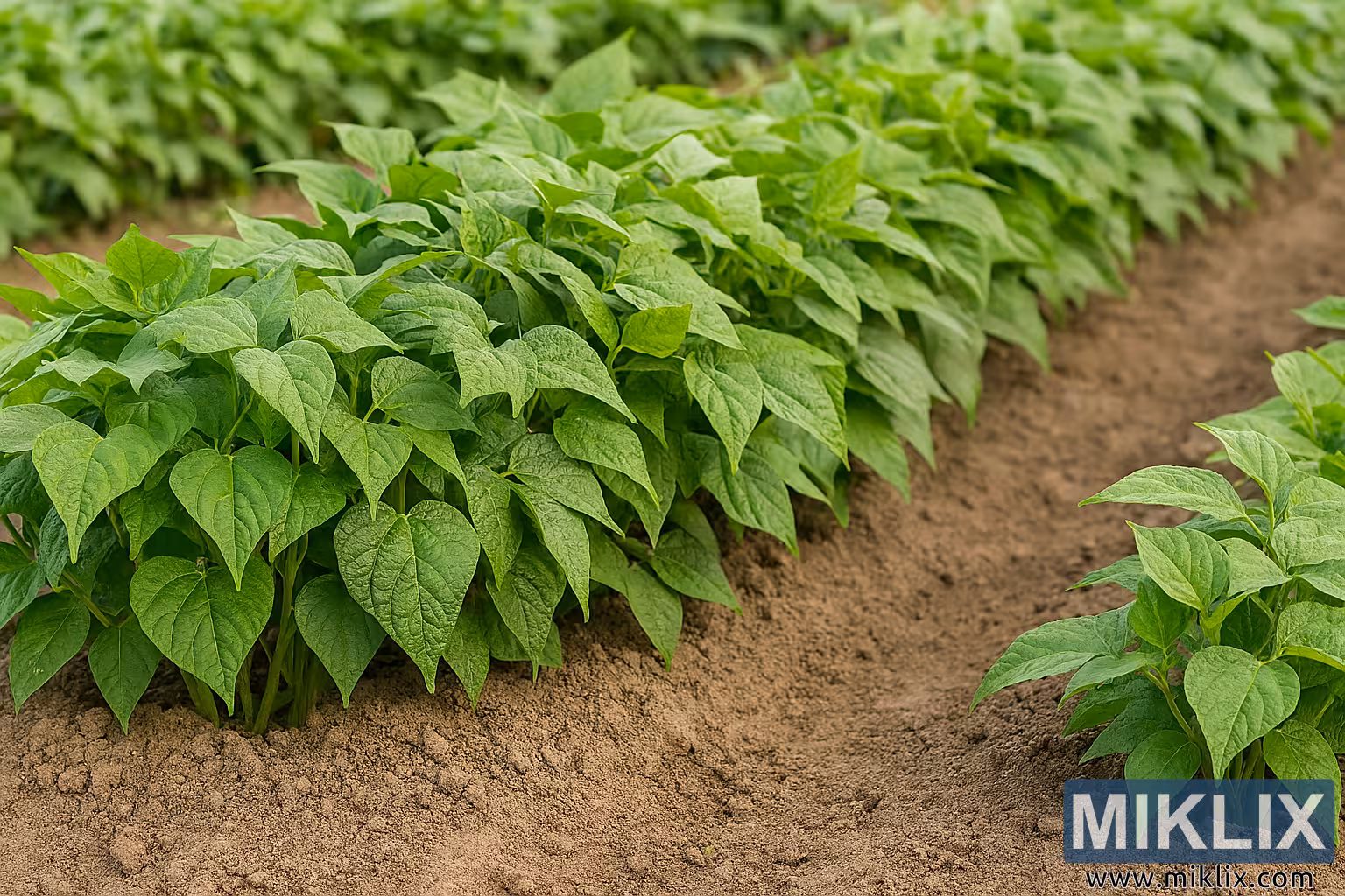 Gambar beresolusi tinggi tanaman kacang semak dalam barisan di kebun, menunjukkan kebiasaan pertumbuhan yang kompak dan dedaunan yang cerah.