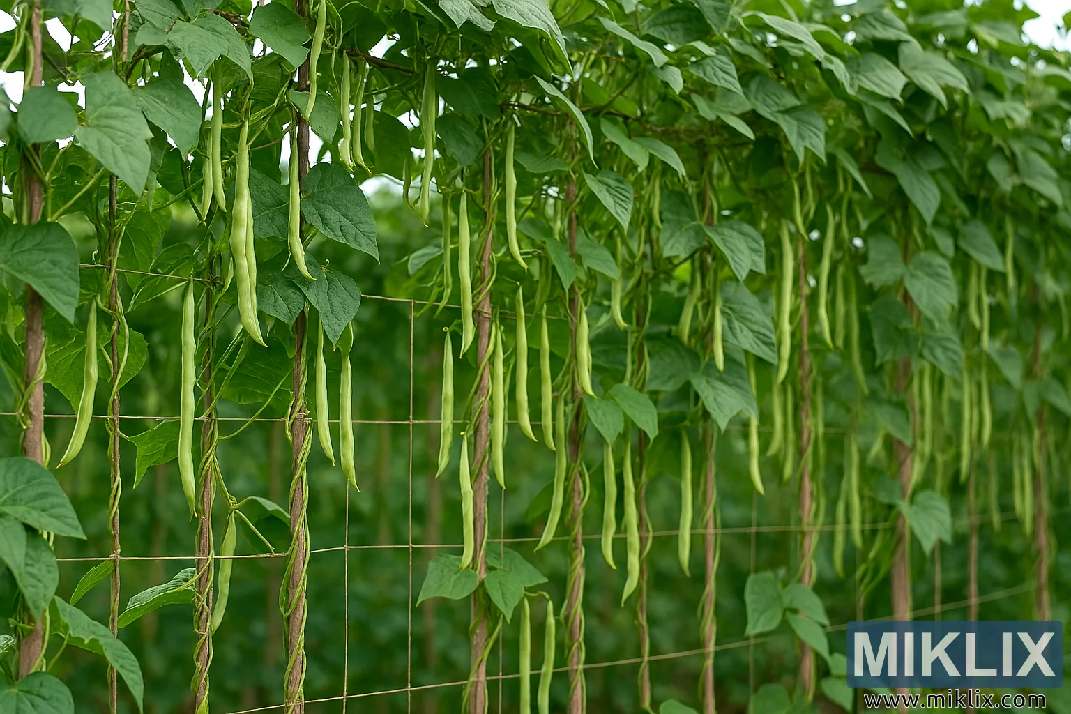 Gambar beresolusi tinggi dari tanaman kacang panjang yang tumbuh di teralis, menampilkan dedaunan yang lebat dan polong kacang yang menggantung melimpah dalam pengaturan hortikultura yang realistis.