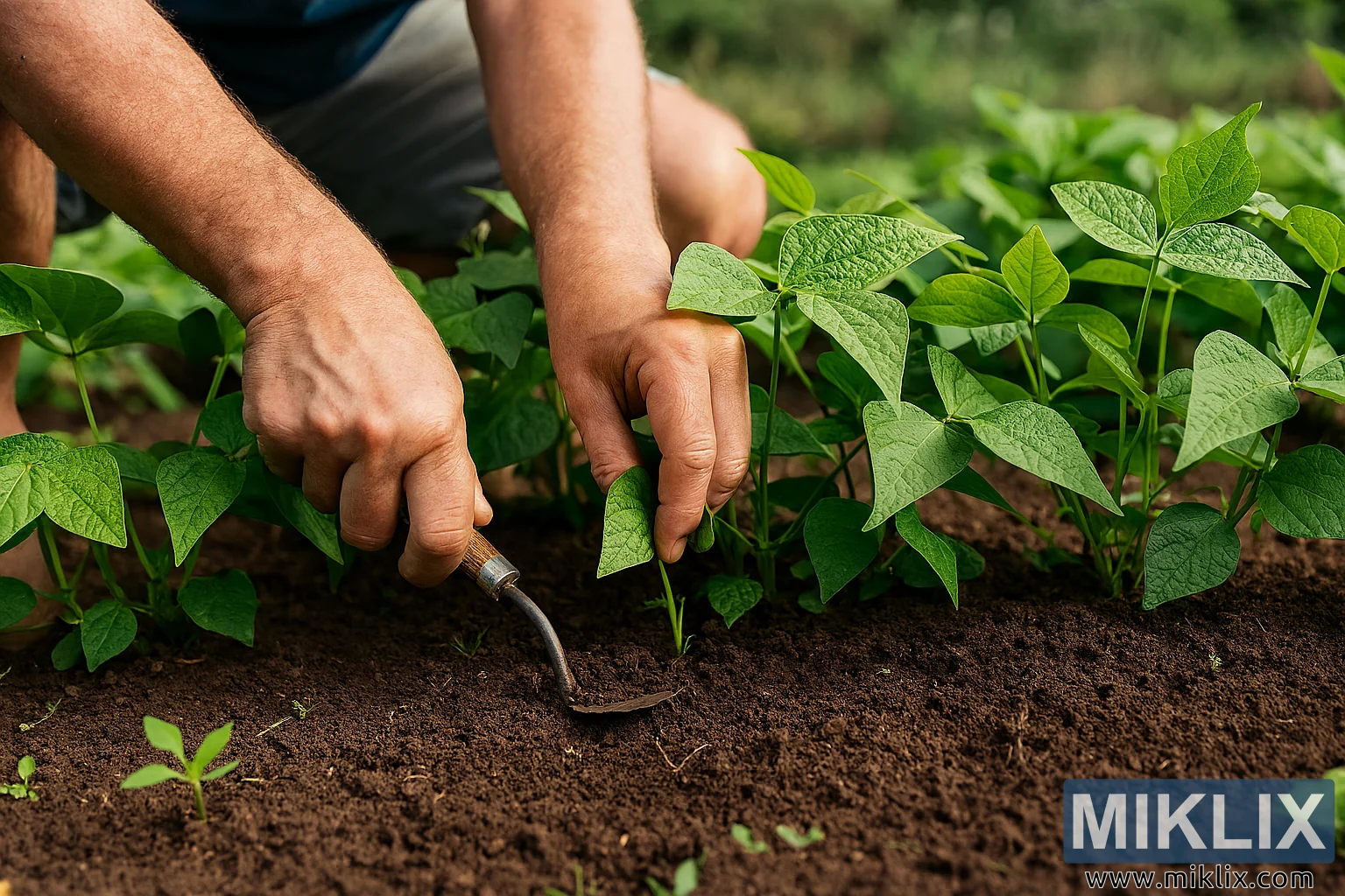 Tampilan jarak dekat seorang tukang kebun dengan hati-hati mencabut gulma di sekitar tanaman kacang hijau, menjaga keutuhan akar dan mendorong pertumbuhan yang sehat.