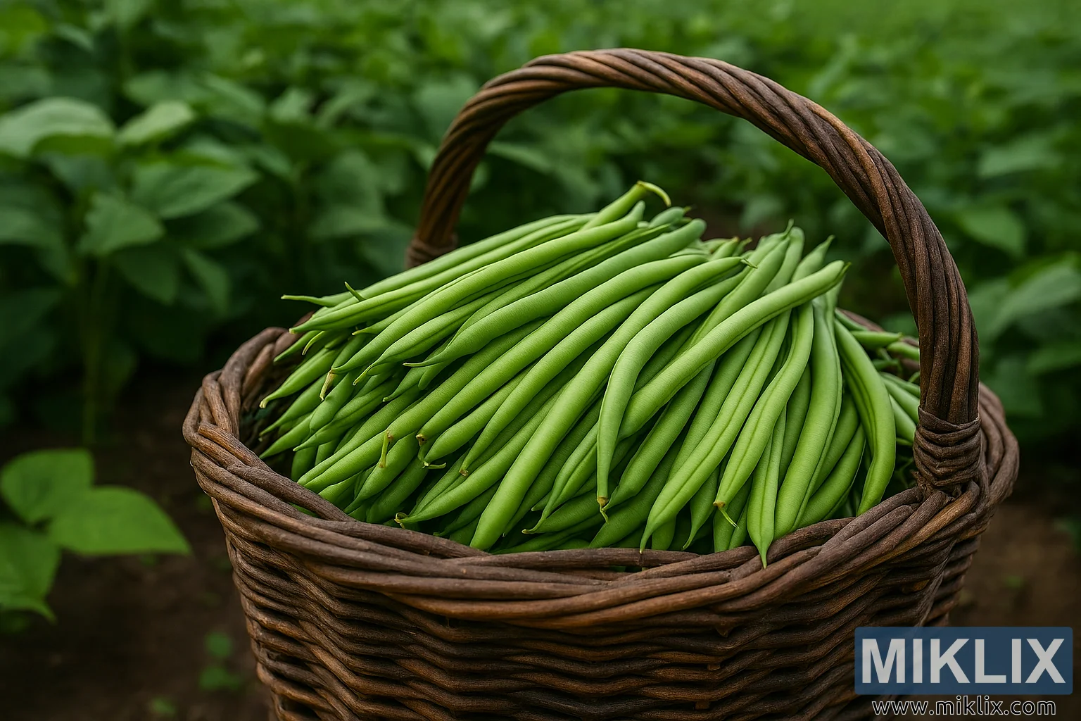 Gambar beresolusi tinggi kacang hijau yang baru dipanen dalam keranjang sederhana, menampilkan ukuran dan kualitas ideal di ladang kebun yang subur.