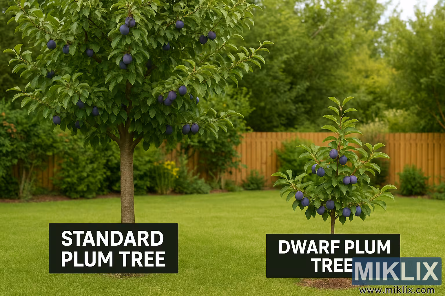 Gambar ini adalah foto lanskap beresolusi tinggi yang tajam, menggambarkan perbandingan berdampingan antara pohon plum standar dan pohon plum kerdil, keduanya tumbuh di kebun rumah yang terawat rapi. Komposisi ini dengan jelas menekankan ukuran keduanya yang kontras sekaligus menunjukkan bahwa keduanya menghasilkan buah yang serupa, memberikan visual informatif bagi para tukang kebun yang mempertimbangkan berbagai bentuk pohon.