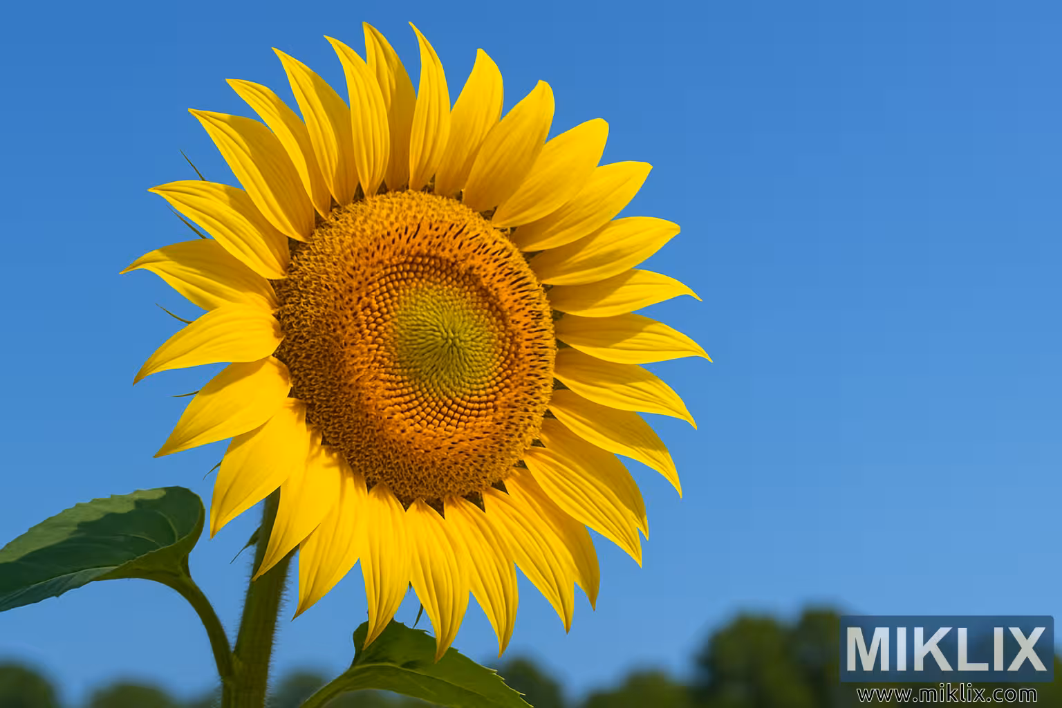 Di latar belakang, garis samar pucuk pohon tampak di cakrawala, memberikan konteks tanpa mengalihkan perhatian dari subjek. Penggunaan kedalaman bidang yang dangkal memastikan bunga matahari tetap menjadi titik fokus utama, sementara latar belakang yang lembut dan buram meningkatkan kesan lapang dan lapang khas ladang musim panas.