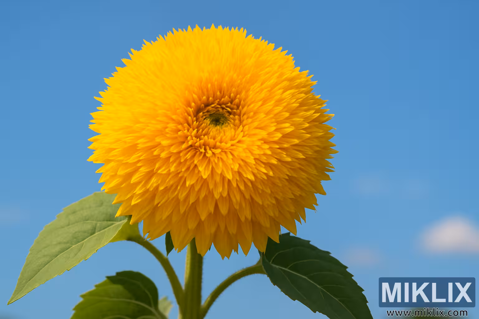 Foto close-up bunga matahari kerdil Teddy Bear yang cemerlang, memamerkan kelopak emasnya yang lebat dan halus serta bunga ganda yang bulat dengan latar langit biru cerah.