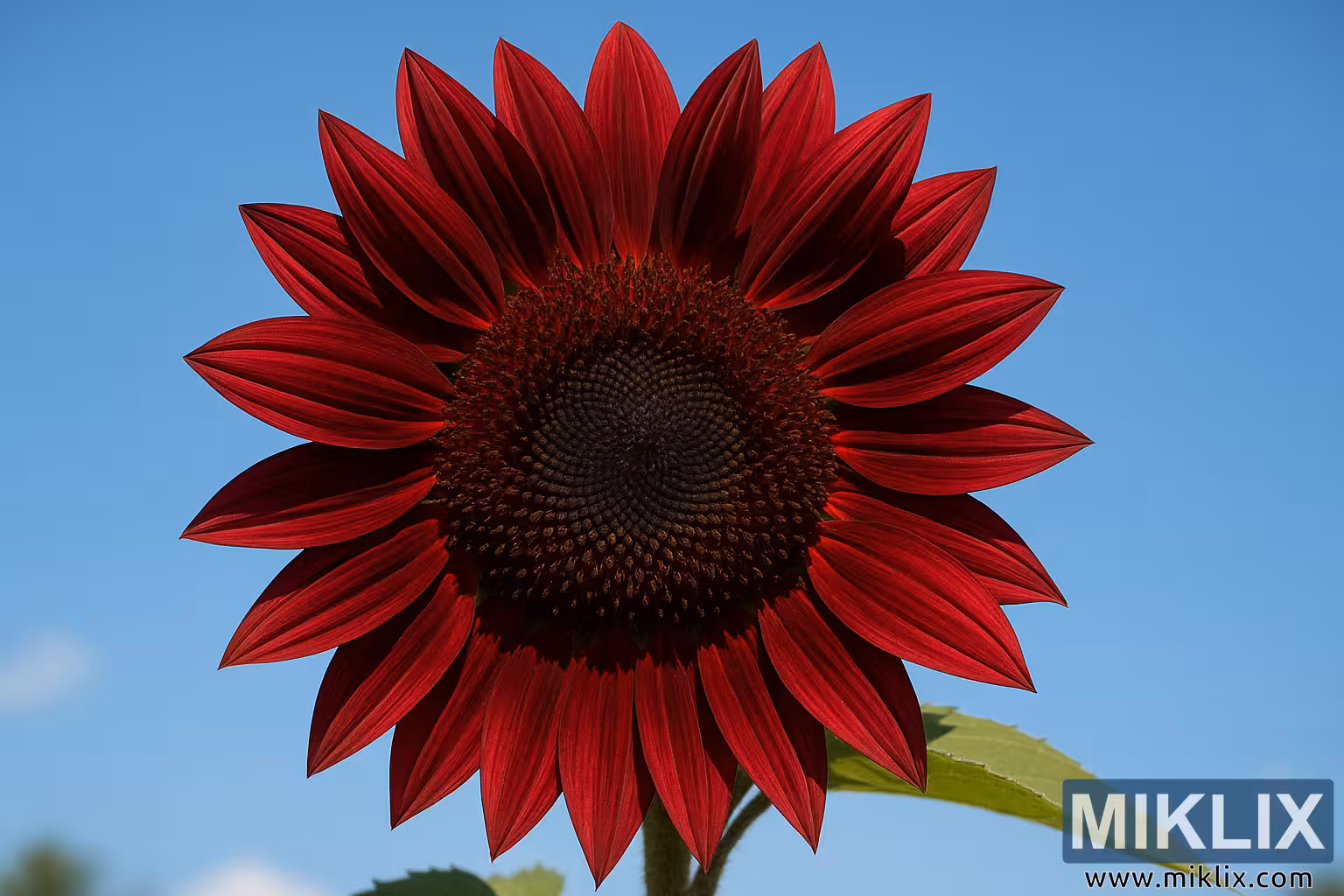 Foto ini adalah foto close-up beresolusi tinggi yang memukau dari bunga matahari Moulin Rouge (Helianthus annuus) — salah satu varietas bunga matahari yang paling mencolok dan dramatis secara visual, terkenal karena kelopaknya yang merah tua selembut beludru serta warnanya yang unik dan kaya warna. Diabadikan saat bunganya mekar sempurna dengan latar langit musim panas yang cerah, foto ini dengan indah menampilkan karakter bunga yang berani dan keanggunannya yang halus, menampilkannya bukan hanya sebagai tanaman tetapi juga sebagai karya seni alami. Setiap detail, mulai dari tekstur rumit cakram di tengahnya hingga kilau halus pada setiap kelopak, ditampilkan dengan sangat jernih, menekankan daya tarik unik dari varietas hias ini.