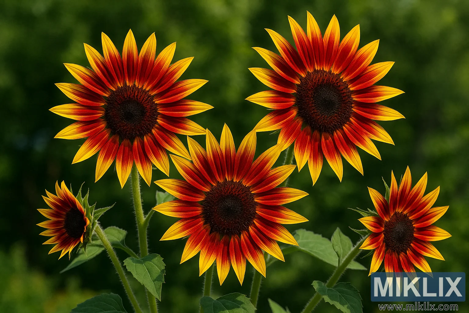 Foto close-up beresolusi tinggi ini menangkap keindahan bunga matahari Firecracker (Helianthus annuus) yang memukau dengan kemegahan multi-batangnya. Dikenal karena kelopaknya yang berwarna dua warna dan bercabang, bunga matahari Firecracker termasuk di antara varietas yang paling dramatis secara visual — dan foto ini dengan sempurna menggambarkan alasannya. Foto ini menampilkan sekelompok bunga dewasa yang memancar keluar dari beberapa batang yang kokoh, warnanya yang cerah dan bentuknya yang mencolok menyerupai ledakan kembang api musim panas yang membeku dalam waktu.